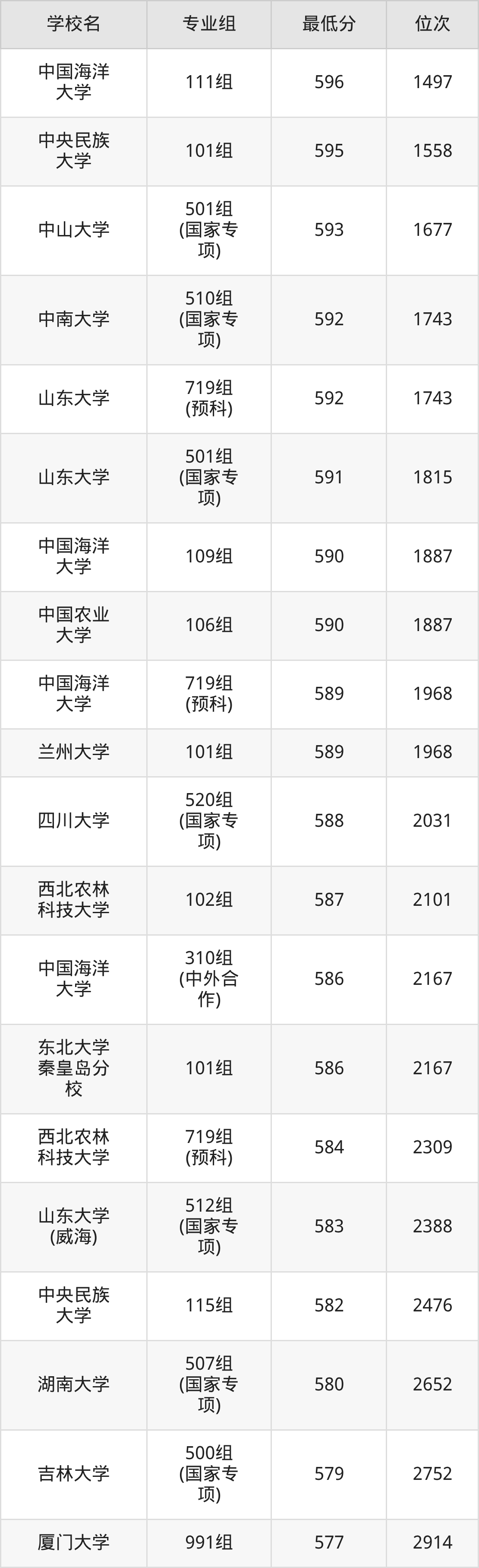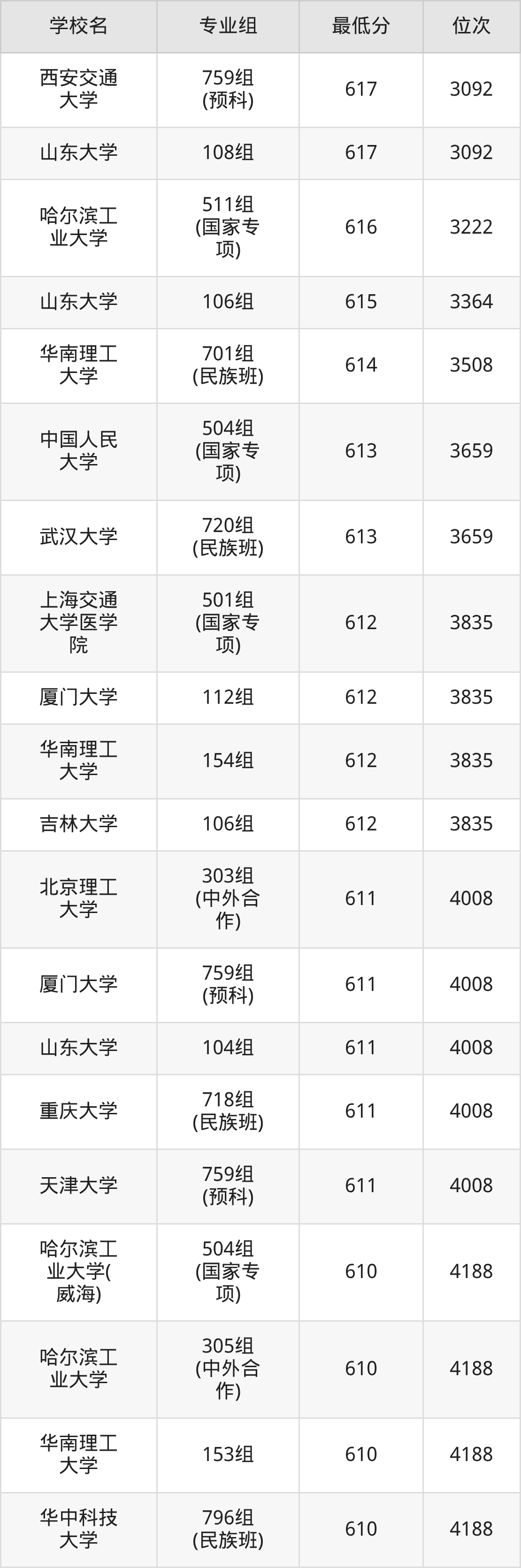 (5)山东大学:2025年985分数线556分到617分,位次区间是21549名到3092名,招生专业组有9个,最低为916组、最高为108组。