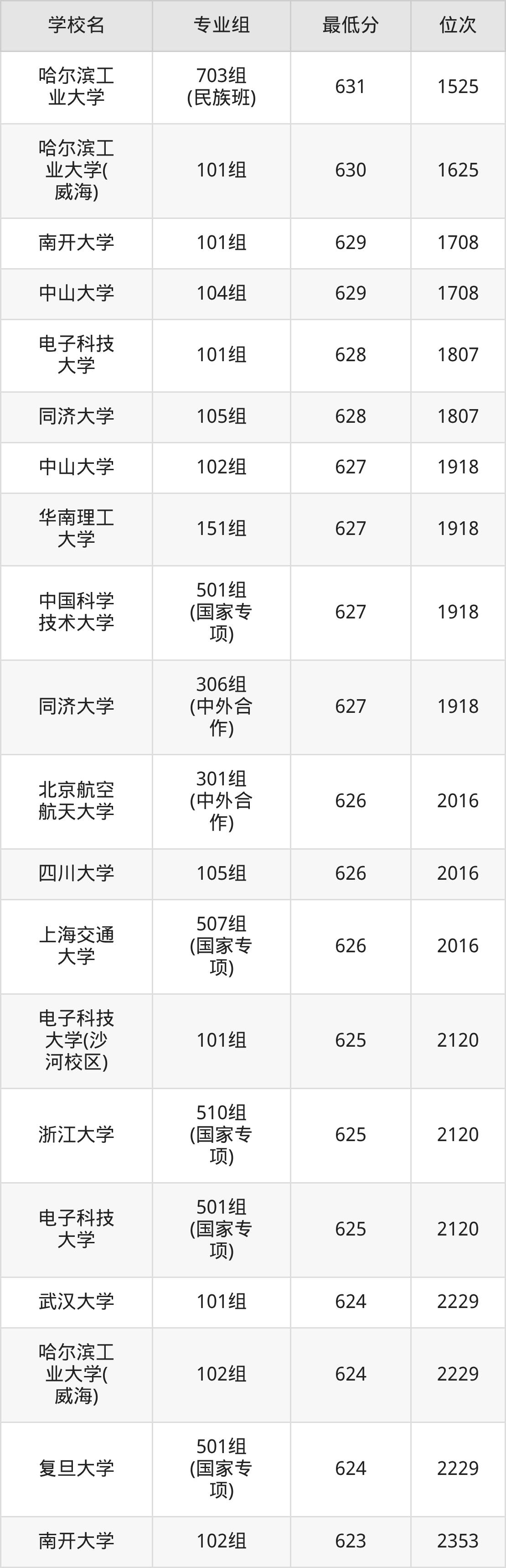 (5)北京航空航天大学:2025年985分数线626分,位次是315名,招生专业组有1个,最低为102组。