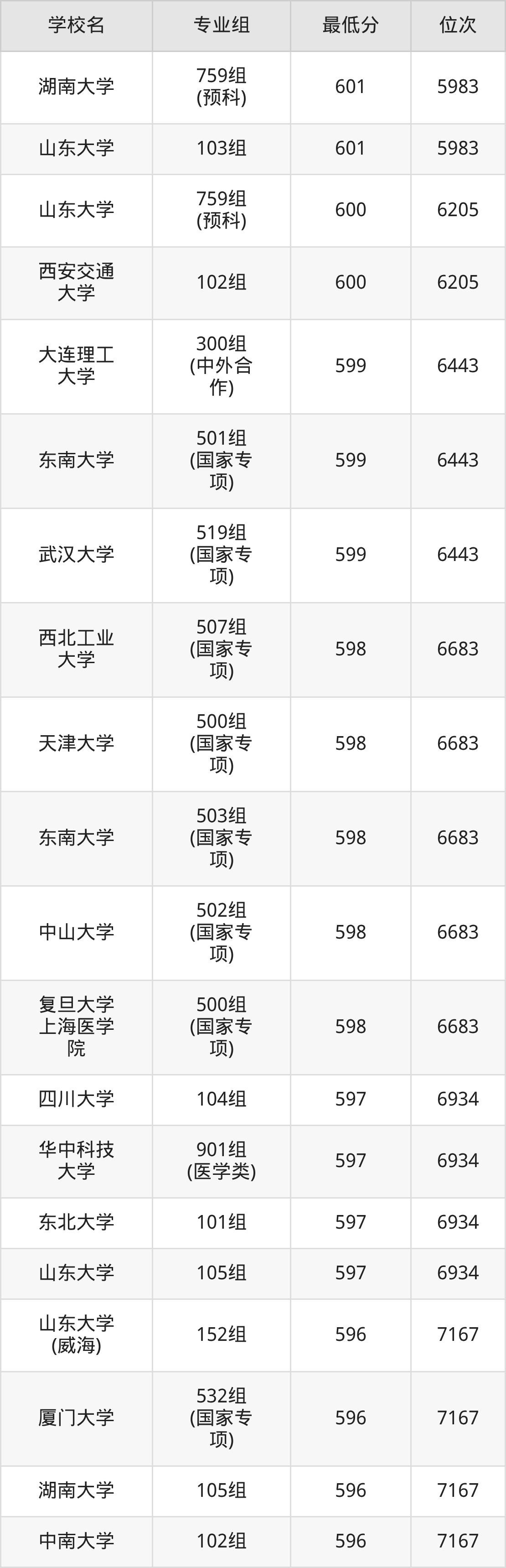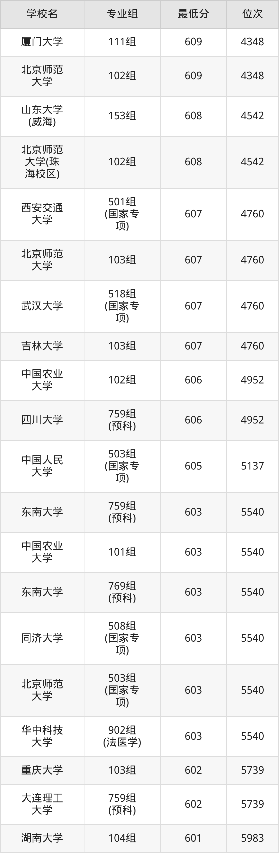 (4)同济大学:2025年985分数线603分到638分,位次区间是5540名到1033名,招生专业组有4个,最低为508组(国家专项)、最高为103组。