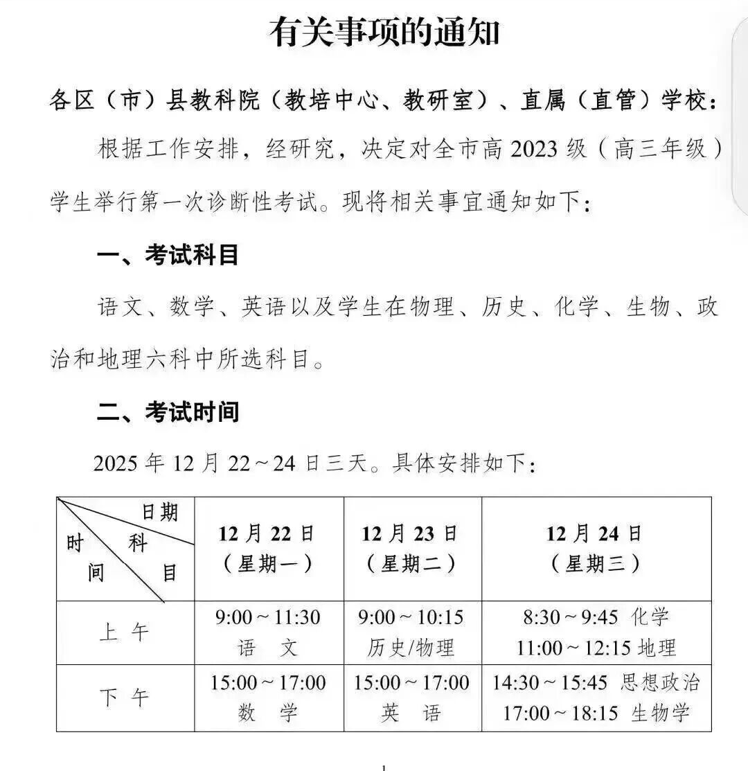 根据官方安排,2026届成都一诊将于12月22日、23日、24日三天进行。这个时间点与往年基本一致,恰好在圣诞节前后,为高三上学期的复习画上一个阶段性的句号。这意味着,从现在起,全体考生的复习节奏需要以此为核心倒排计划,在剩余的两个多月时间里,完成知识点的系统梳理与整合,并进入高强度的综合模拟训练阶段。