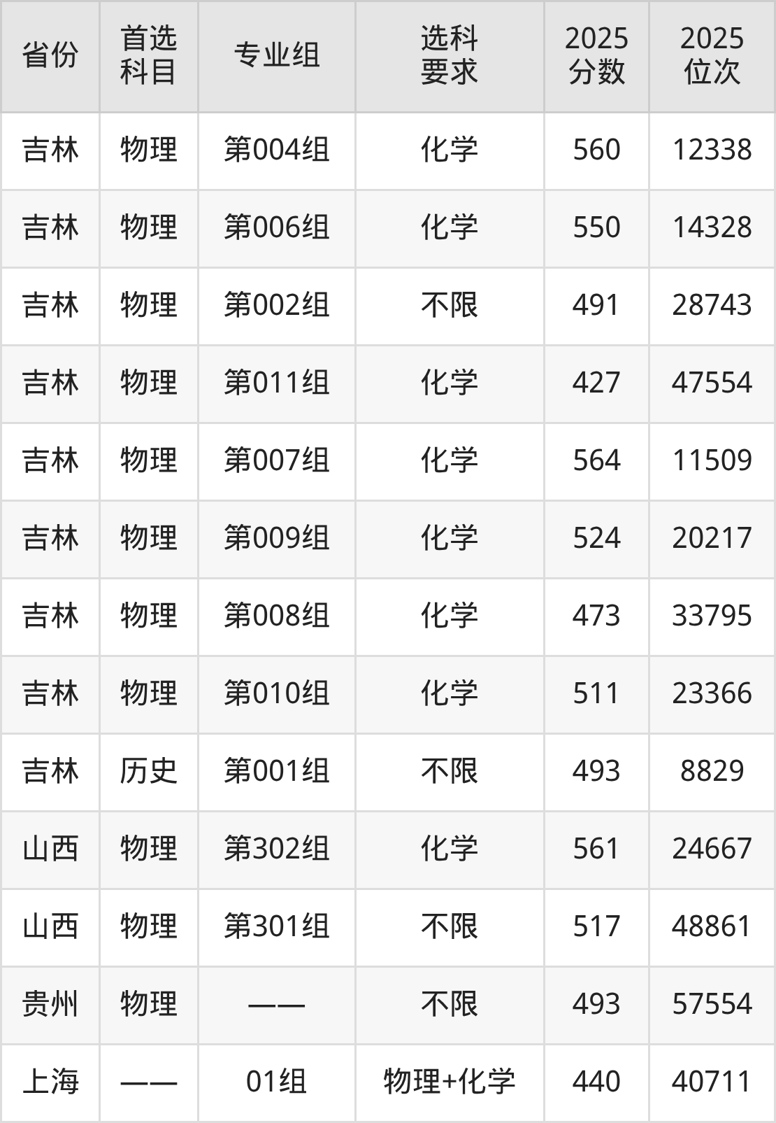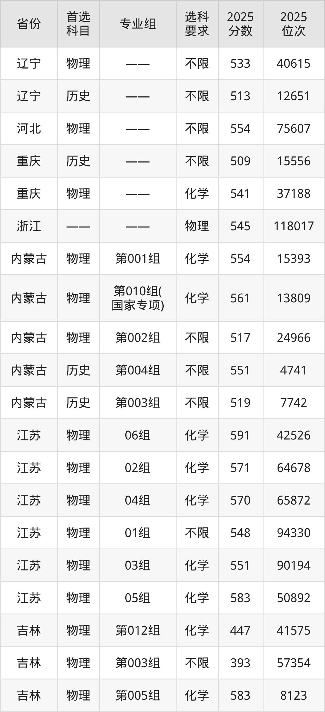 物理类各专业组分数线:第001组554分、第010组(国家专项)561分、第002组517分。