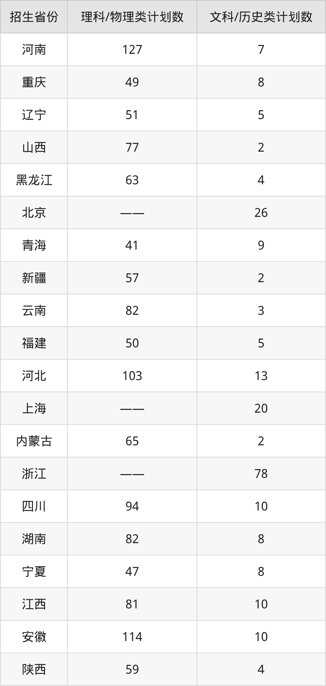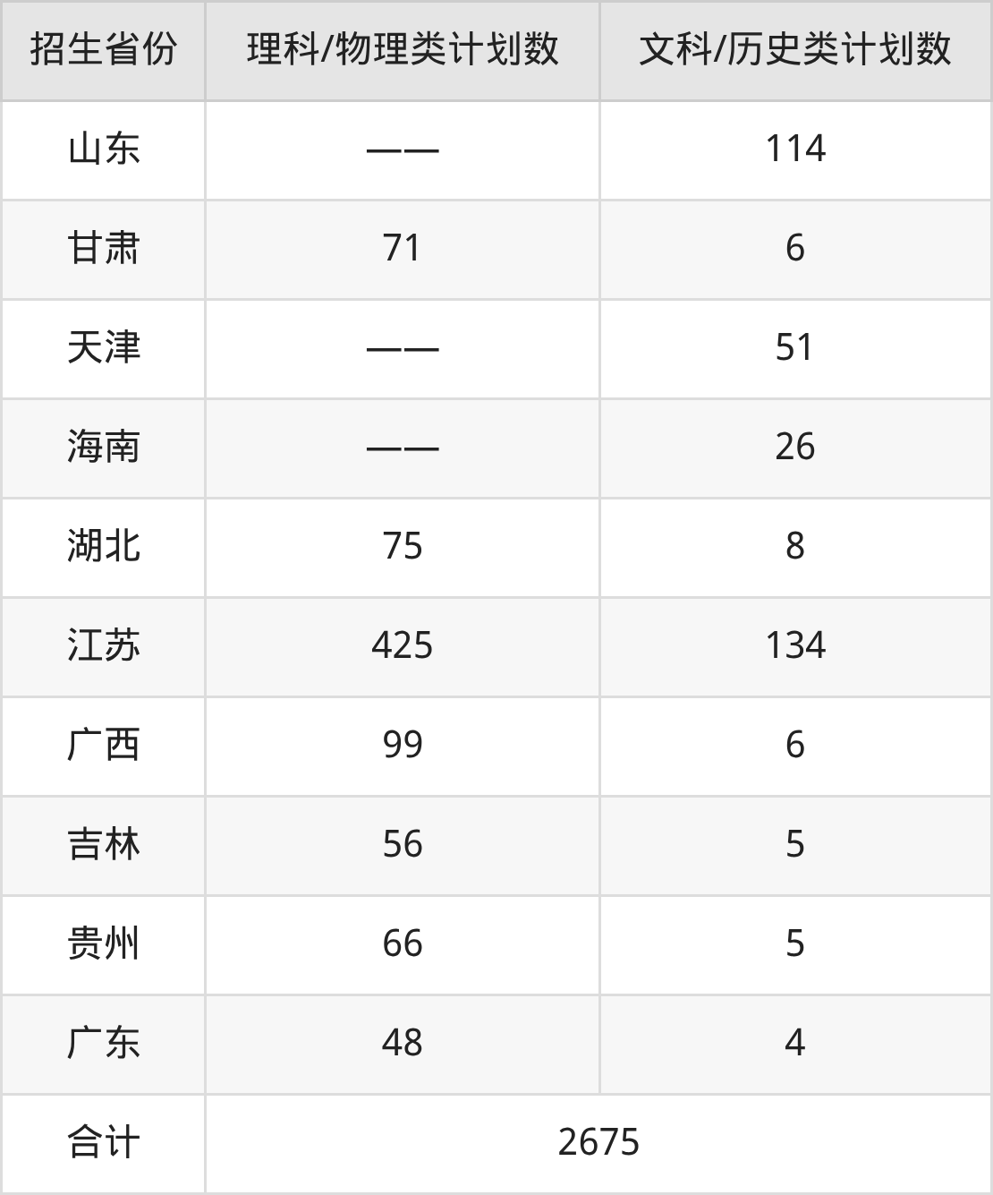 分科类招生计划:文科2人、理科57人、3+3省份315人、历史类276人、物理类2025人