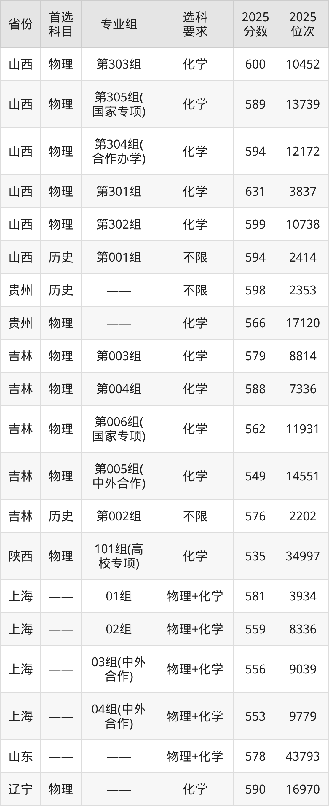 物理类各专业组分数线:第303组600分、第305组(国家专项)589分、第304组(合作办学)594分、第301组631分、第302组599分。