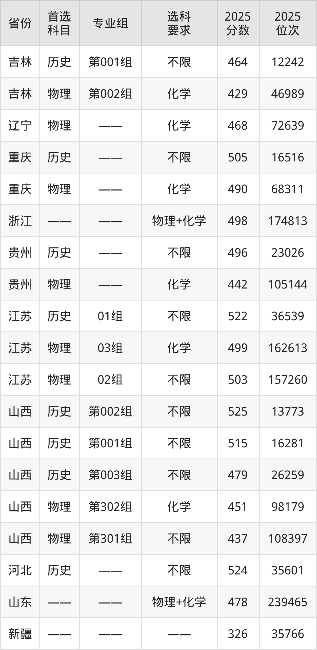 历史类各专业组分数线:第001组464分。