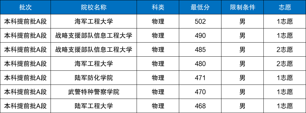 2023年录取分数在400分~500分左右的军校只有三所,它们招收到的全为理科男生,最低收分为462分(海军工程大学)。