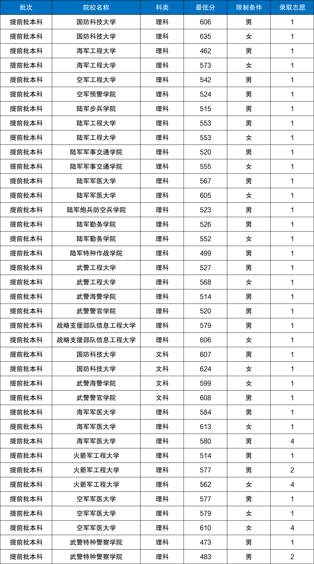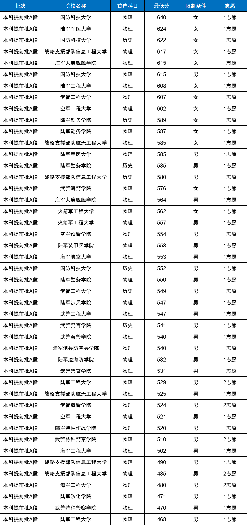 2023年军校都在提前批进行录取,大部分省份都只公布了军校投档分(军检线),录取分数线数据较少,不过大都在500分以上。