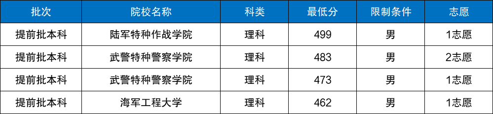 全国400分~500分的军校其实并不多。以贵州省为例,录取分数线在400分~500分左右的只有海军工程大学(男462分)、武警特种警察学院(男473分)、陆军特种作战学院(男499分)。