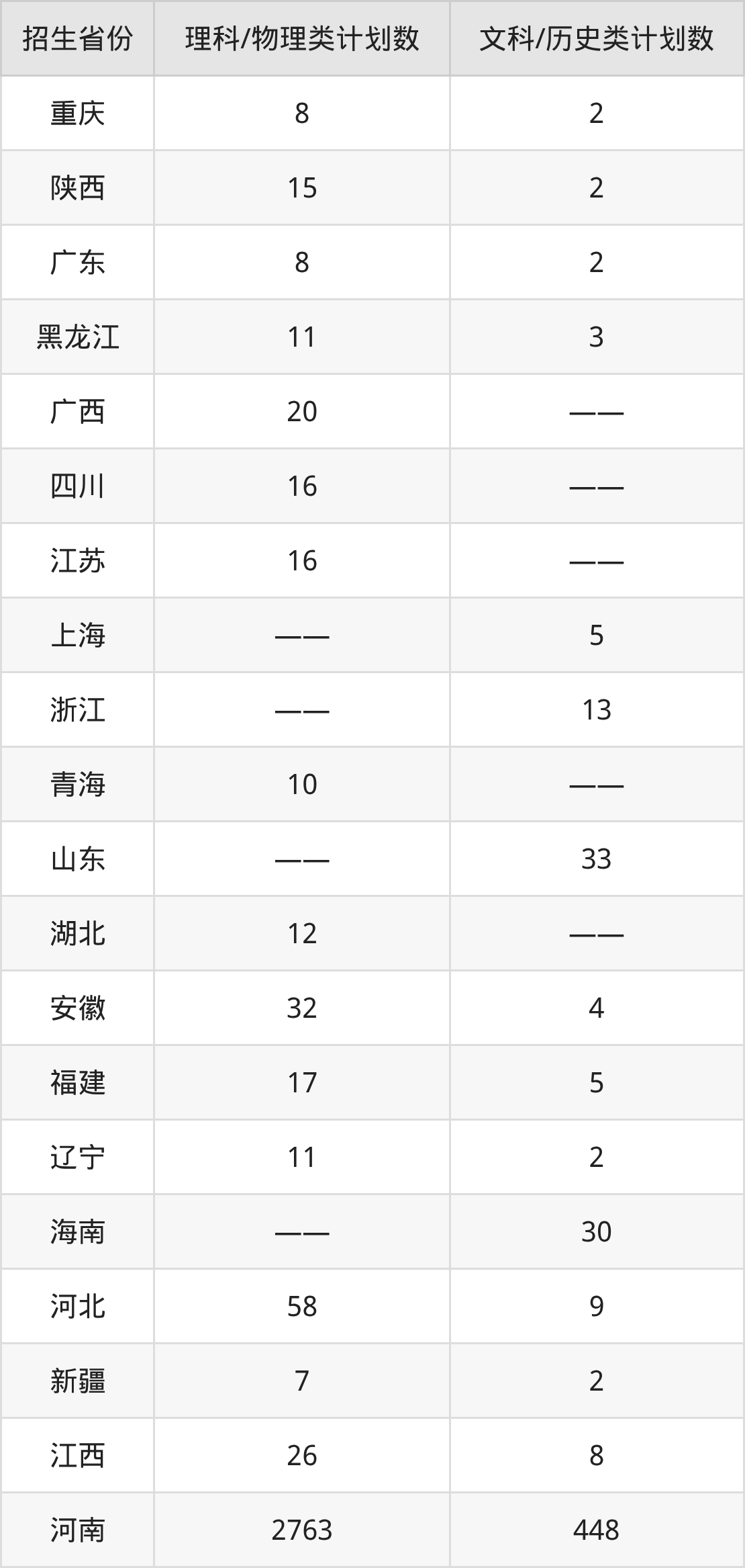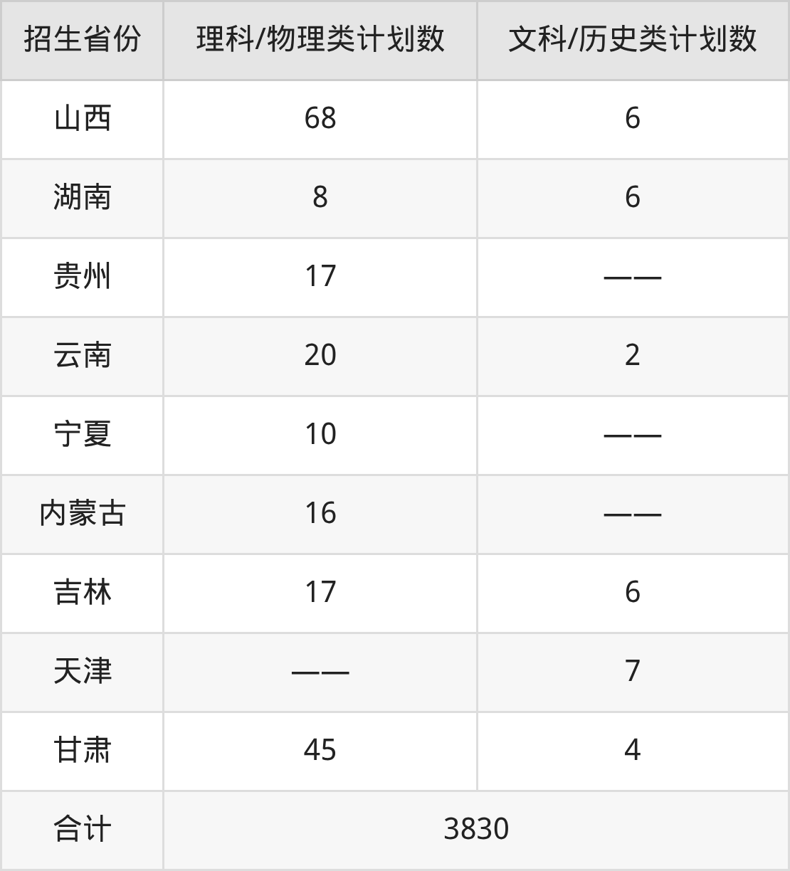 分科类招生计划:文科2人、理科7人、历史类509人、物理类3224人、3+3省份88人
