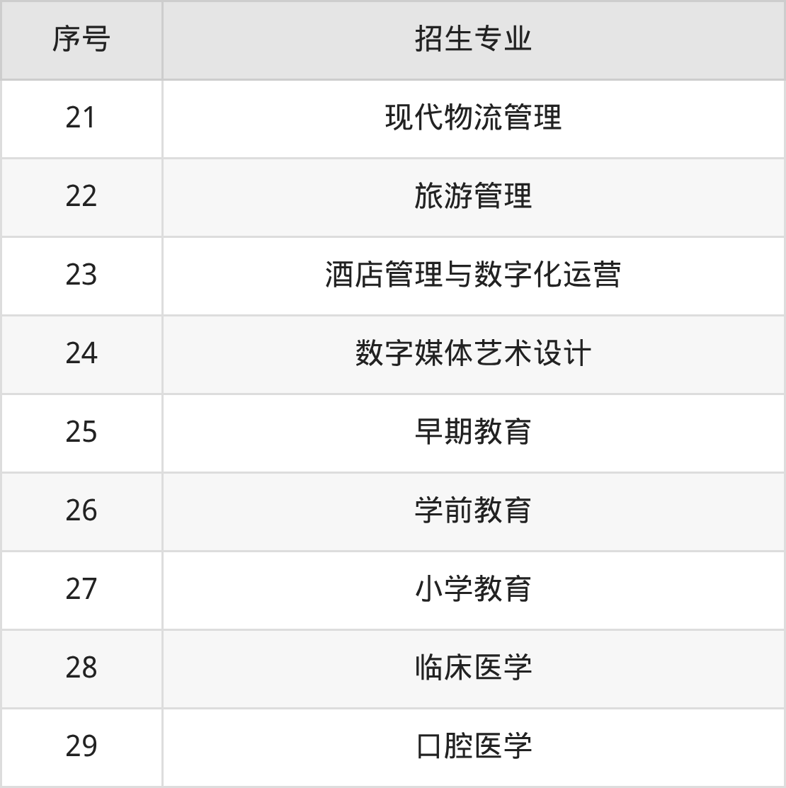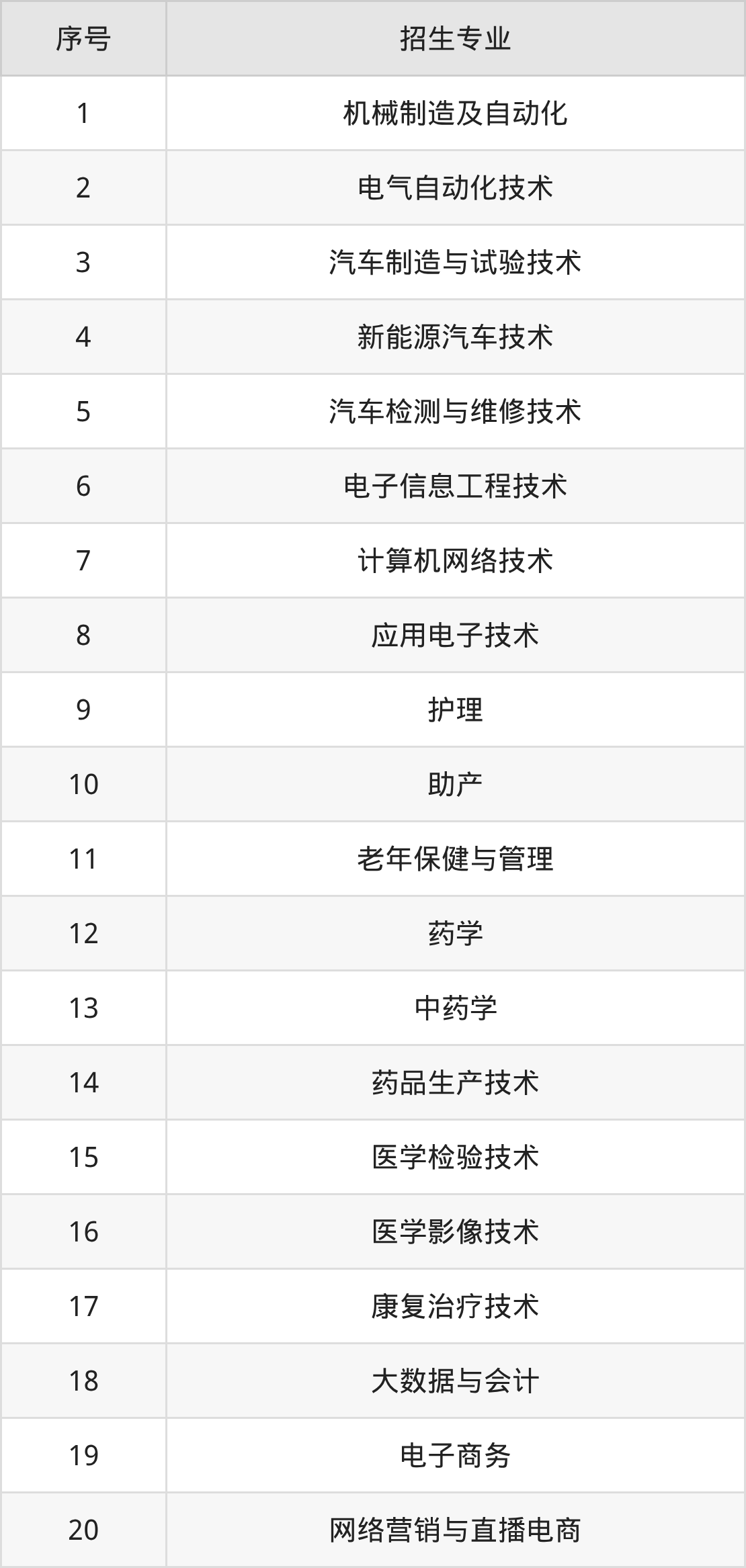 中草药栽培与加工技术、园林技术、动物医学、畜牧兽医、水产养殖技术、食品检验检测技术、工程测量技术、建筑室内设计、建筑工程技术、建设工程监理