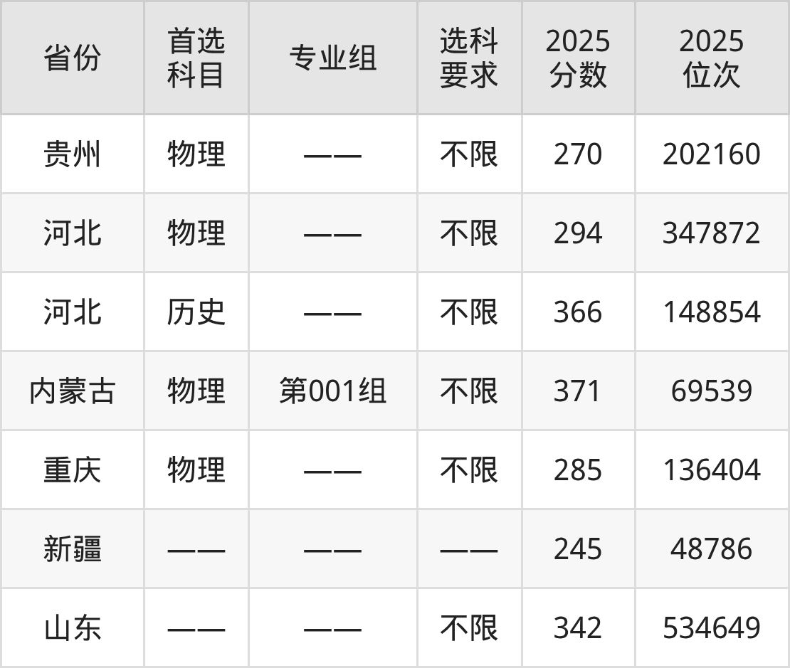 6、山东2025年汉中职业技术学院在山东最低录取分数线:342分。