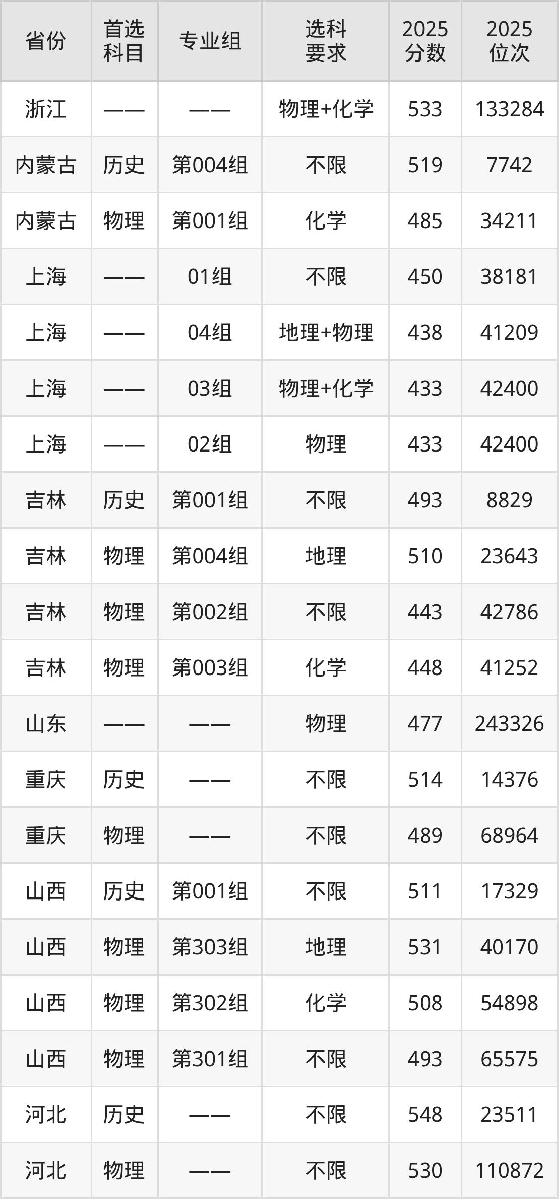 物理类各专业组分数线:第303组531分、第302组508分、第301组493分。