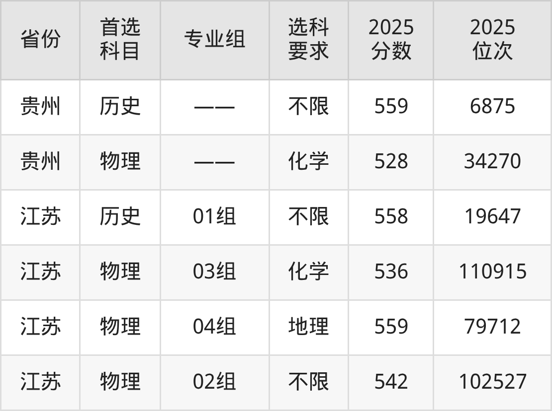 物理类各专业组分数线:03组536分、04组559分、02组542分。