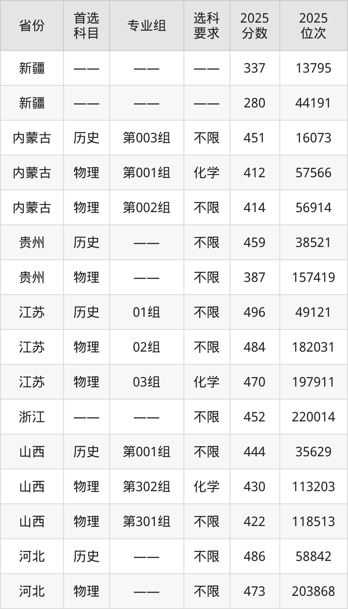 历史类各专业组分数线:第003组451分。