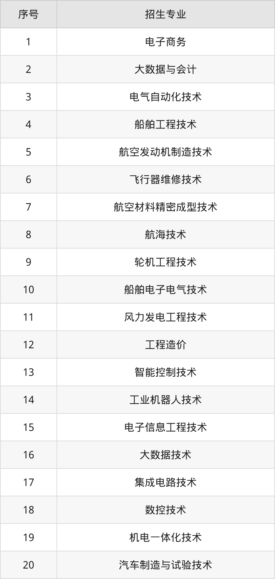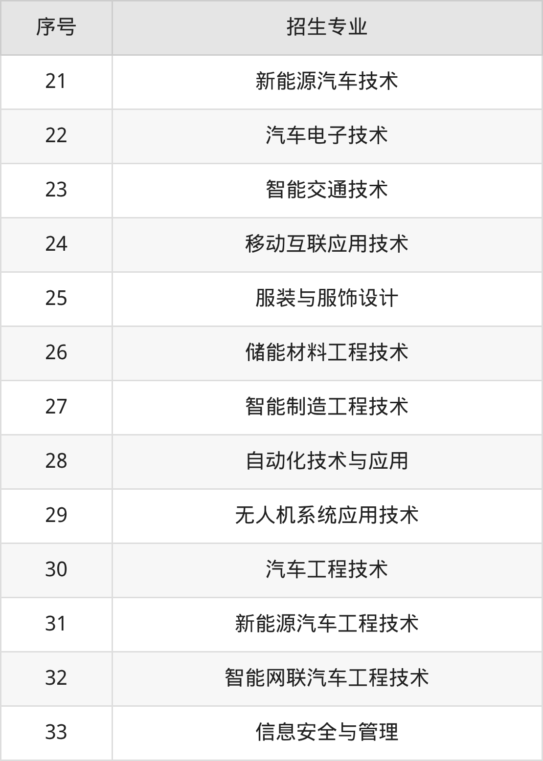 汽车检测与维修技术、计算机网络技术、机械制造及自动化、信息安全技术应用、大数据与财务管理、全媒体电商运营、智能交通管理、汽车服务工程技术、数字媒体艺术、市场营销