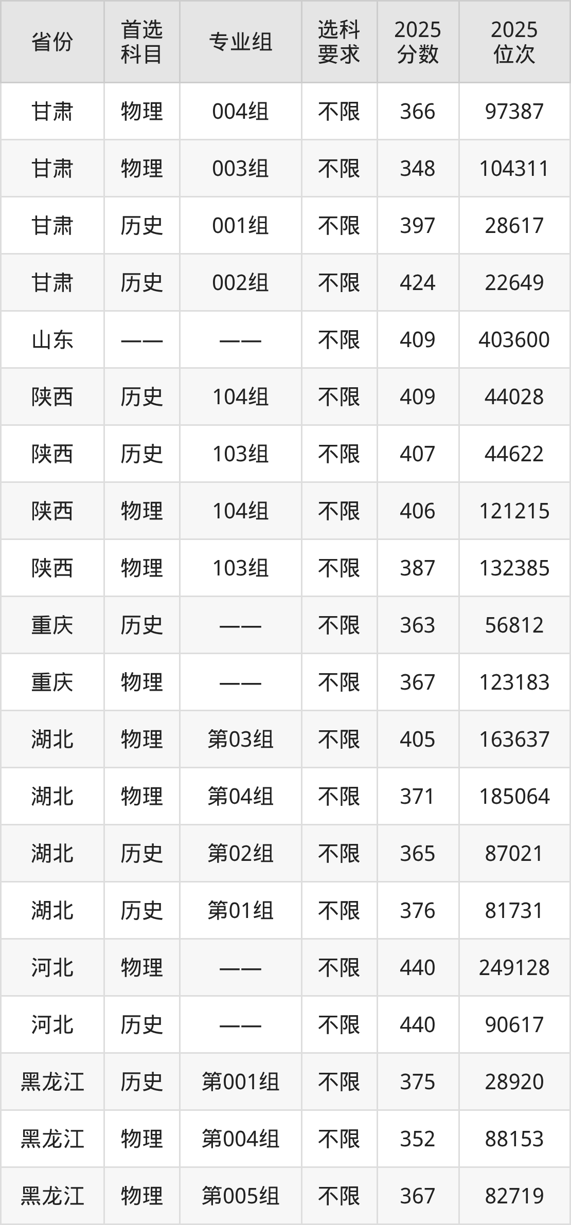 历史类各专业组分数线:第001组375分。