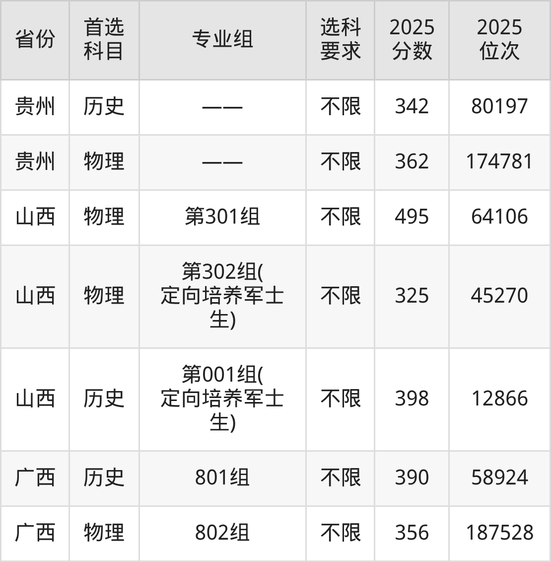 物理类各专业组分数线:第301组495分、第302组(定向培养军士生)325分。