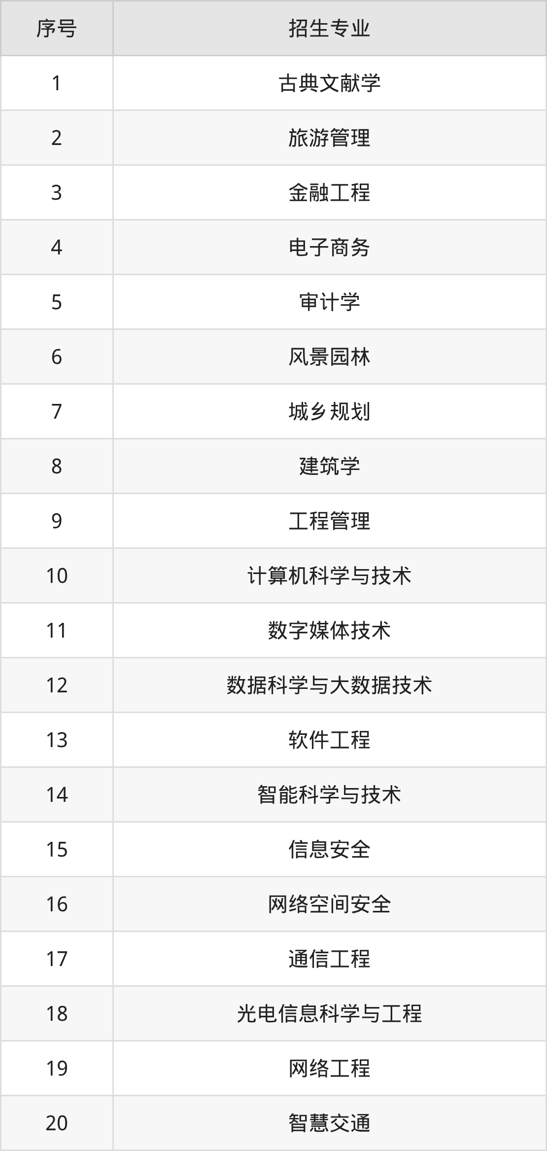 会计学、财务管理、市场营销、金融学、物流管理、国际经济与贸易、英语、数字出版、行政管理、汉语国际教育