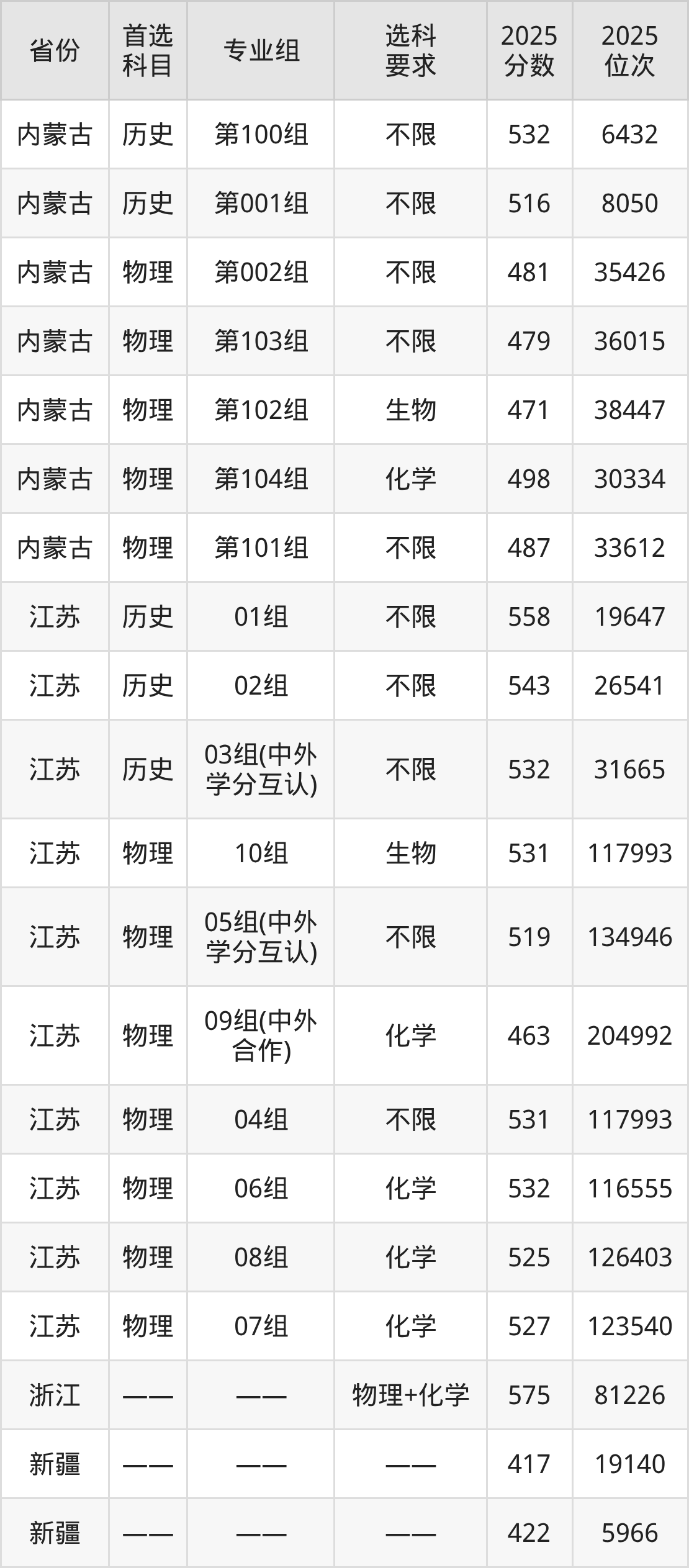 物理类各专业组分数线:10组531分、05组(中外学分互认)519分、09组(中外合作)463分、04组531分、06组532分、08组525分、07组527分。