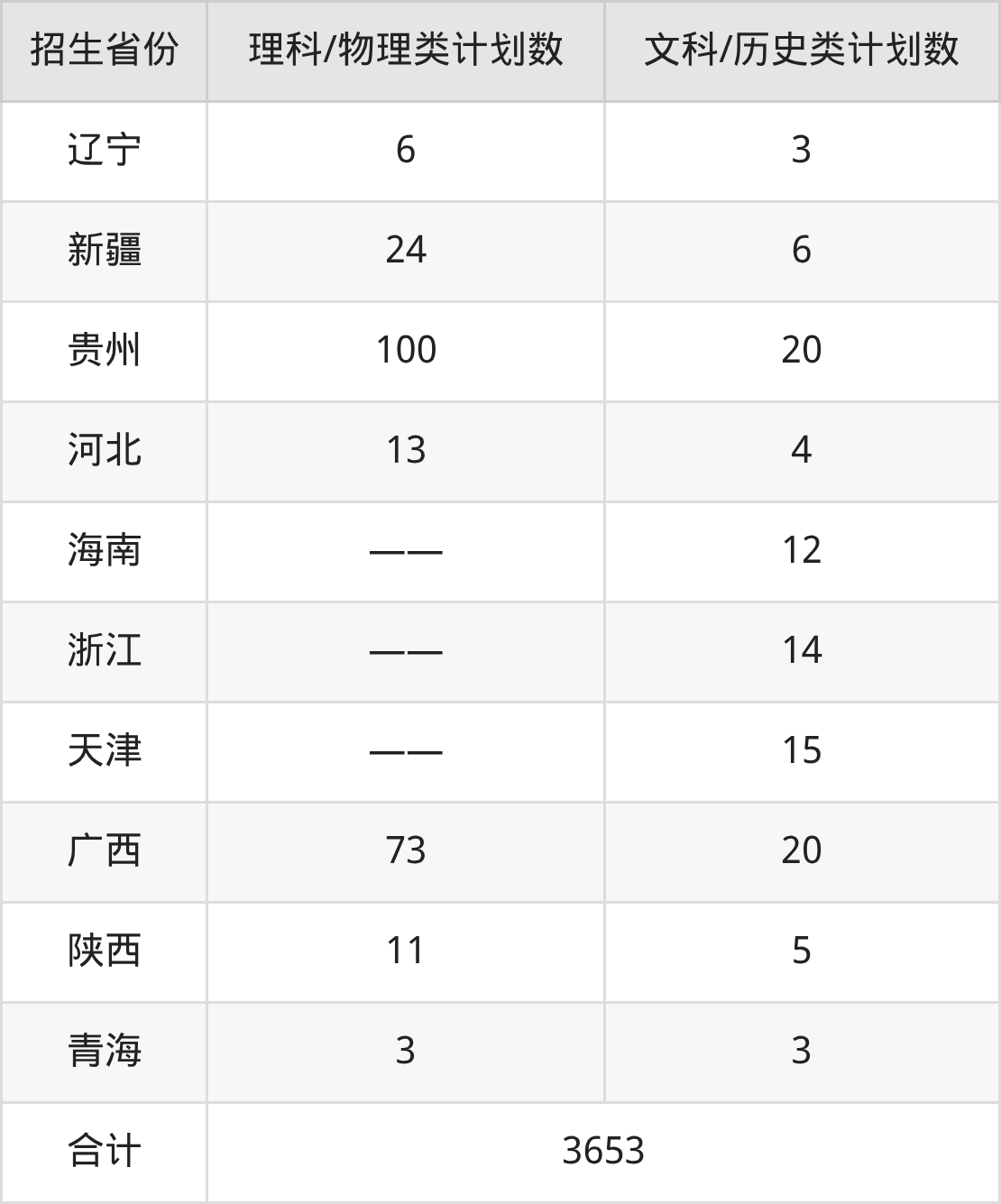 分科类招生计划:物理类3014人、3+3省份80人、文科6人、理科24人、历史类529人