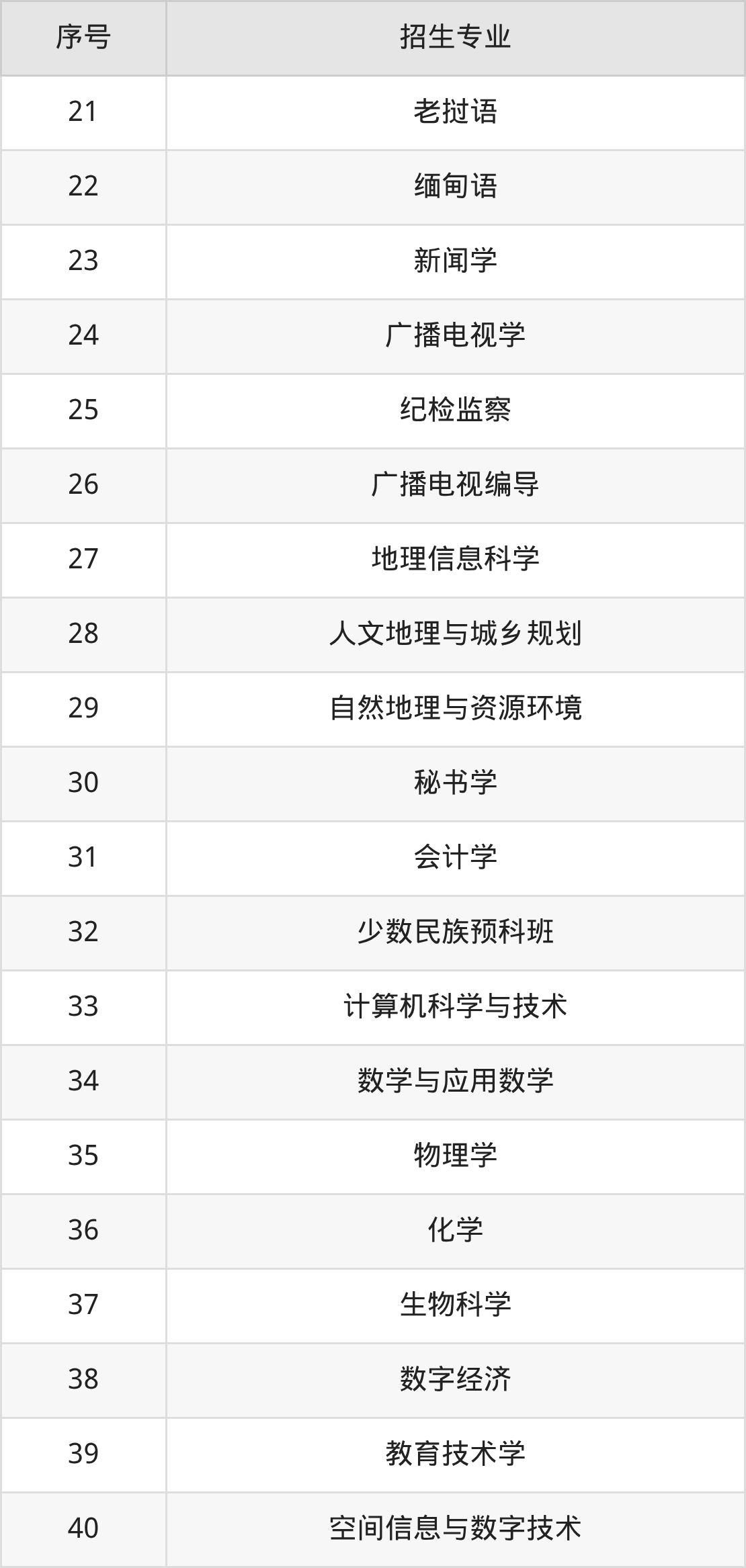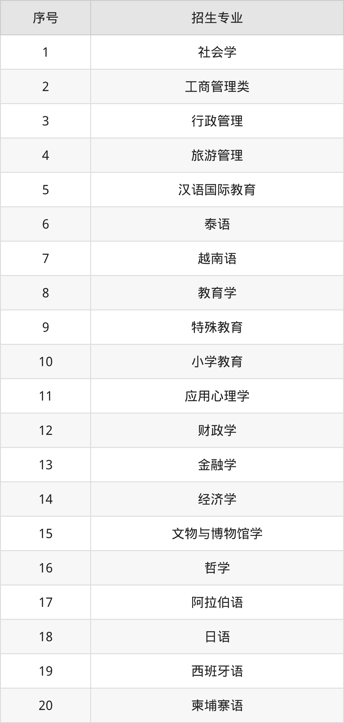 体育教育、美术学、学前教育、英语、历史学、地理科学、汉语言文学、思想政治教育、法学、社会工作