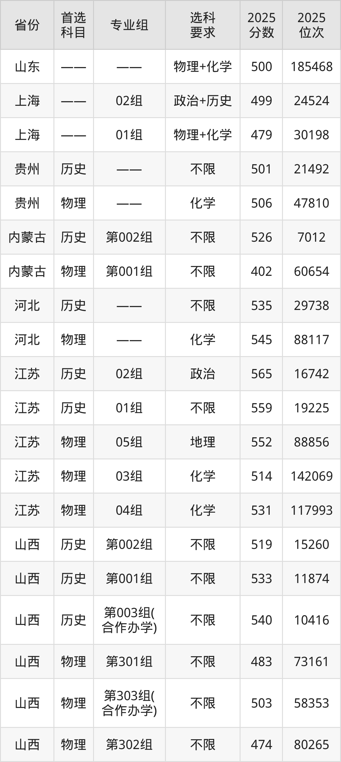 历史类各专业组分数线:第002组519分、第001组533分、第003组(合作办学)540分。