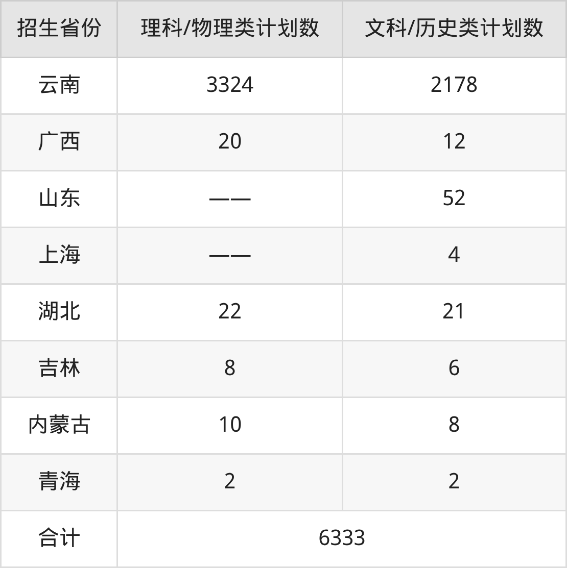 云南师范大学招生简章显示:学校在全国28个省(市、自治区)招收6333人,包括历史类2473人、物理类3728人、3+3省份132人,招生专业有体育教育、美术学、学前教育等。