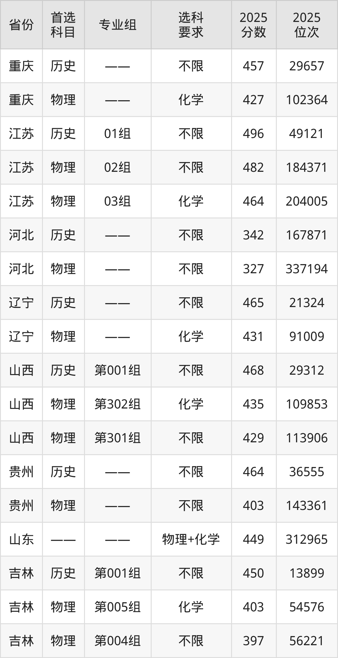 历史类各专业组分数线:第001组468分。