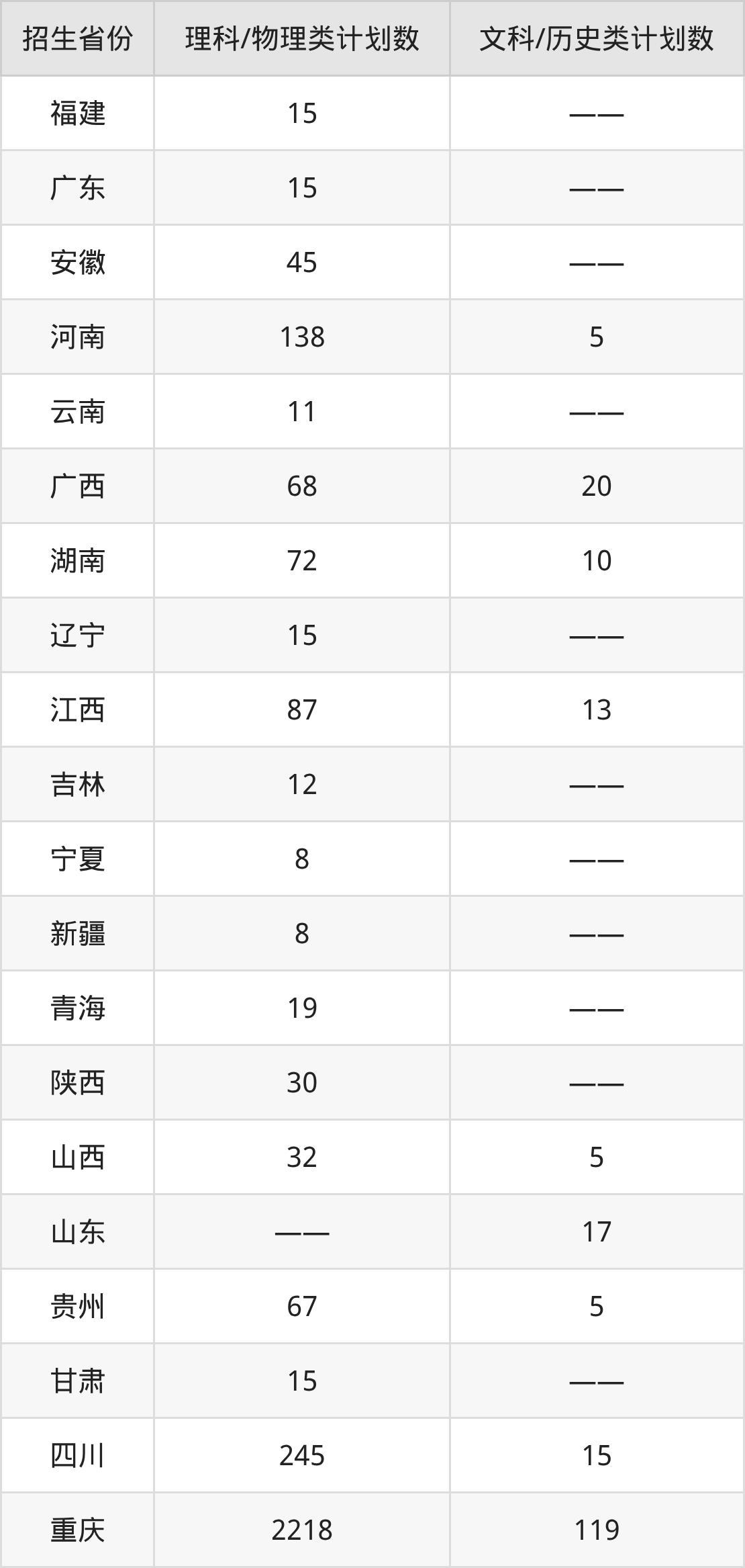 重庆机电职业技术大学招生简章显示:学校在全国22个省(市、自治区)招收3385人,包括物理类3149人、历史类206人、3+3省份22人、理科8人,招生专业有机电一体化技术、汽车制造与试验技术、社区康复等。