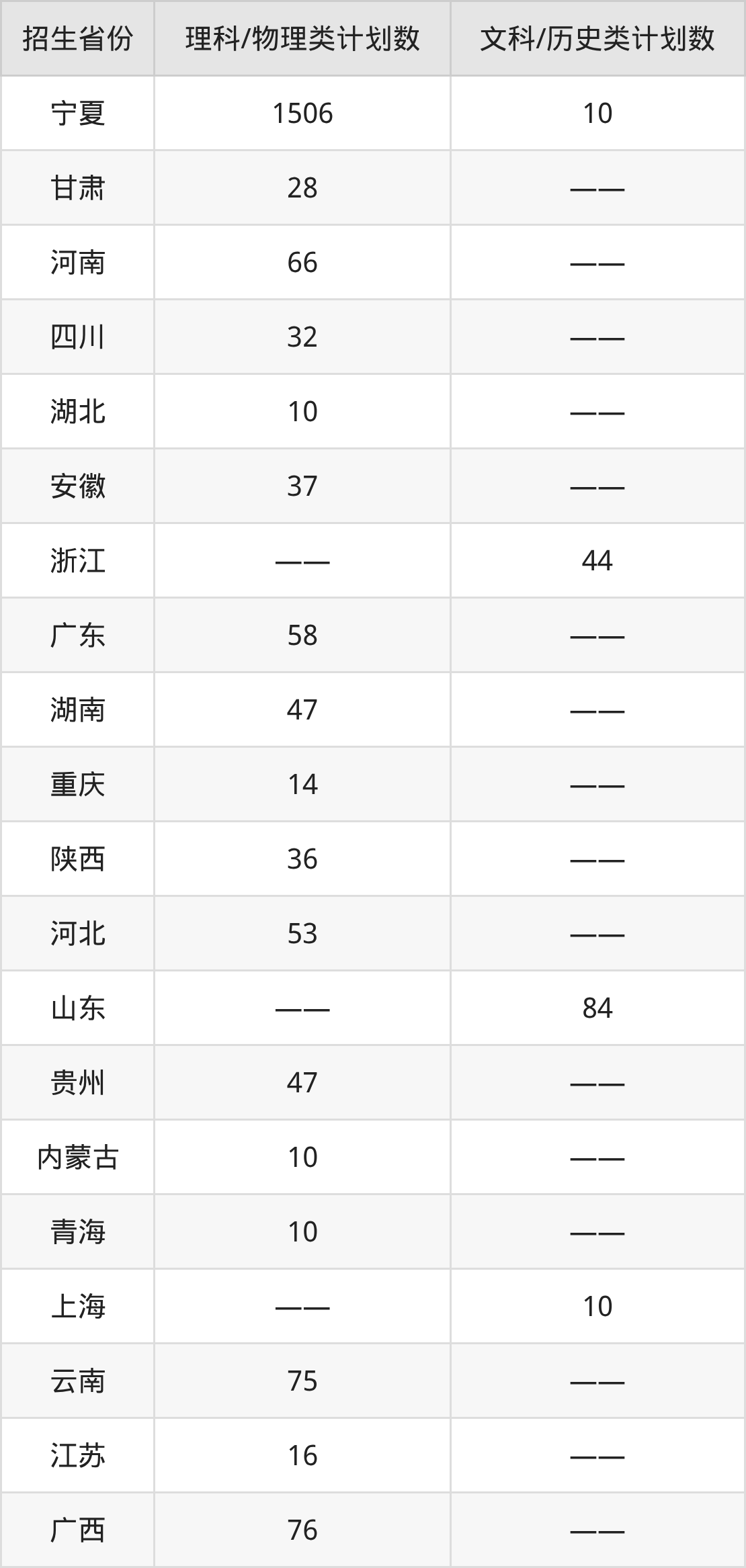 宁夏医科大学招生简章显示:学校在全国23个省(市、自治区)招收2350人,包括历史类10人、物理类2202人、3+3省份138人,招生专业有公共事业管理、临床医学、中医学等。