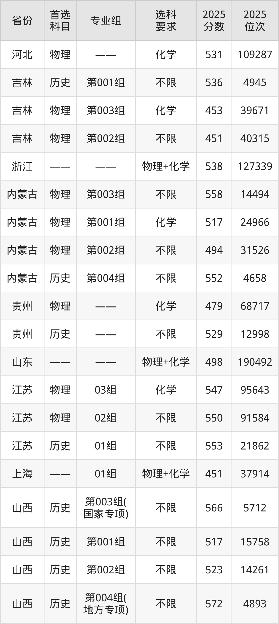 物理类各专业组分数线:第003组558分、第001组517分、第002组494分。