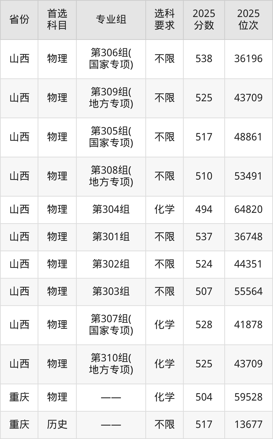 物理类各专业组分数线:第306组(国家专项)538分、第309组(地方专项)525分、第305组(国家专项)517分、第308组(地方专项)510分、第304组494分、第301组537分、第302组524分、第303组507分、第307组(国家专项)528分、第310组(地方专项)525分。