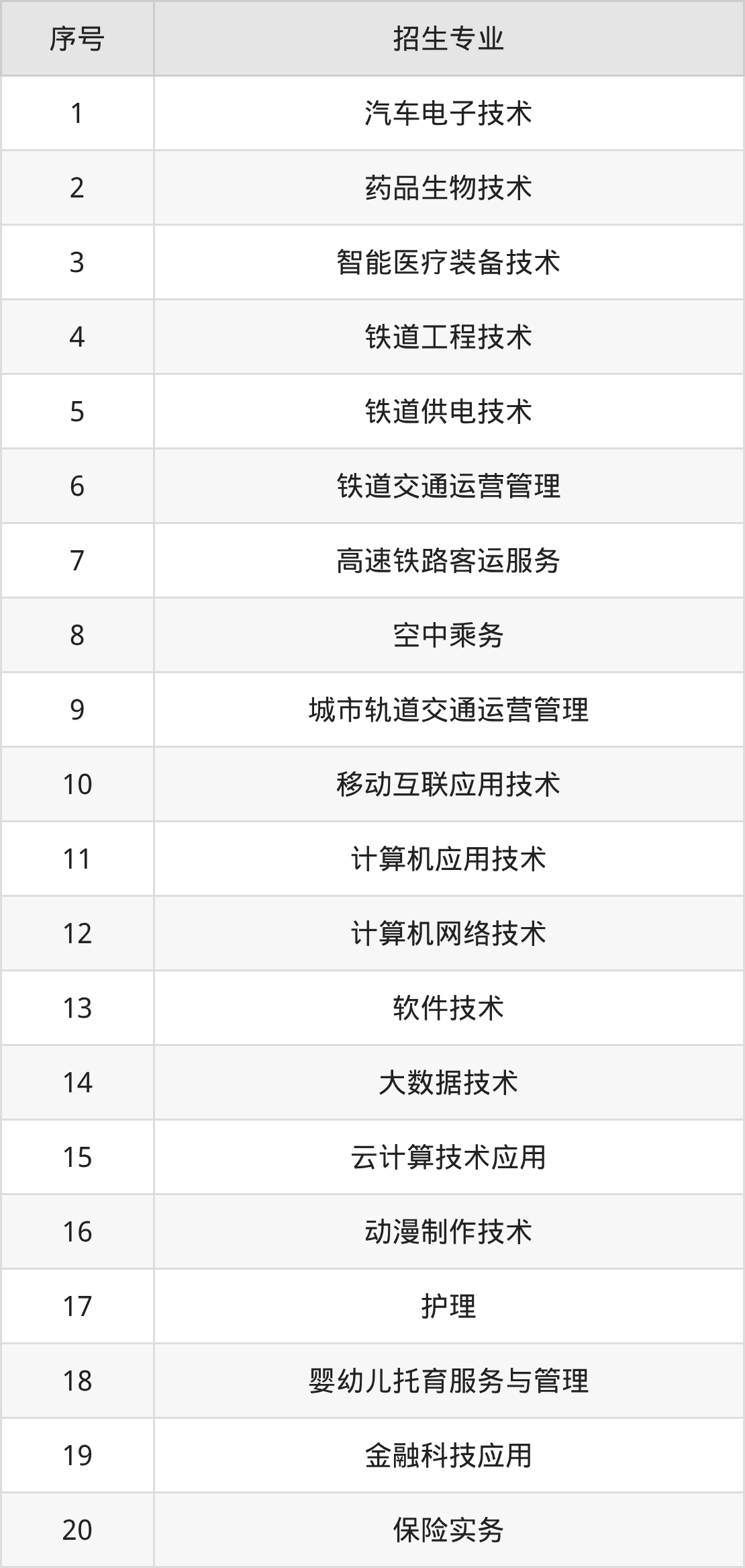 绿色食品生产技术、园林技术、畜牧兽医、工程测量技术、发电运行技术、工程造价、建设工程管理、建设工程监理、机电一体化技术、汽车制造与试验技术