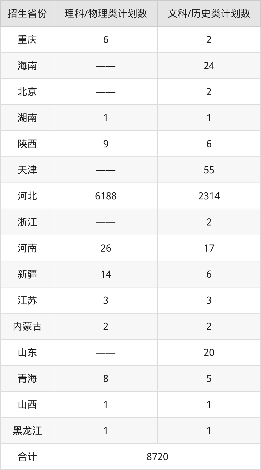 分科类招生计划:文科6人、理科14人、历史类2352人、物理类6245人、3+3省份103人