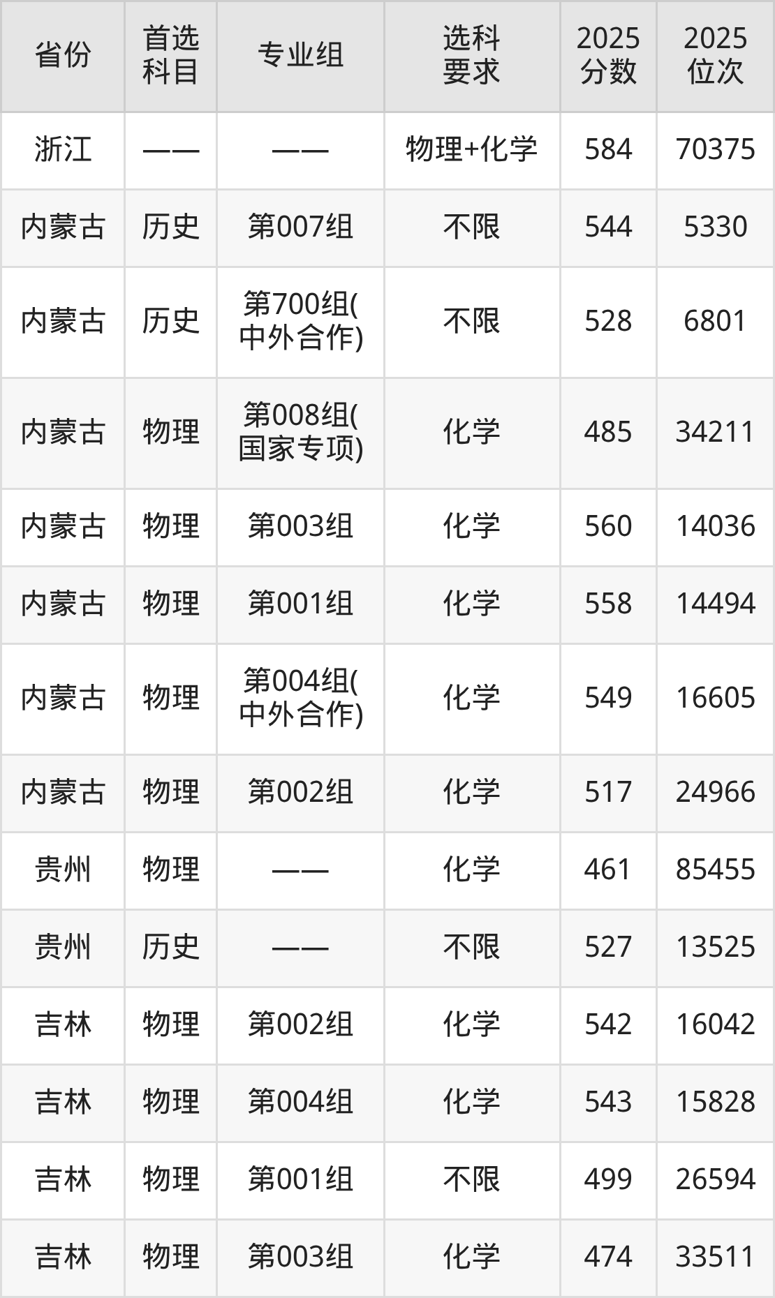 历史类各专业组分数线:第007组544分、第700组(中外合作)528分。