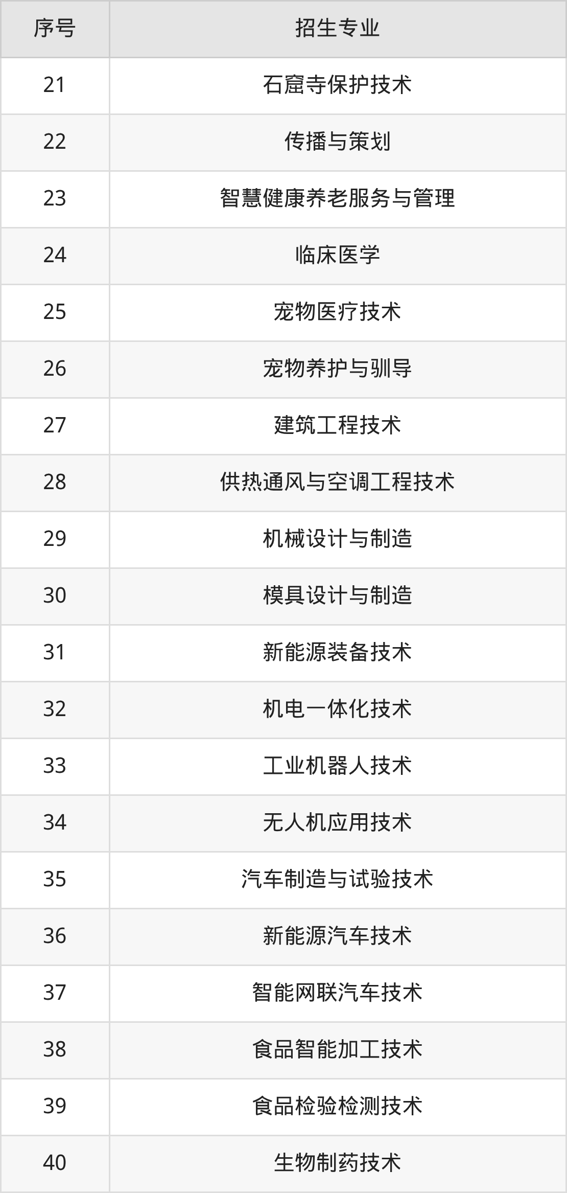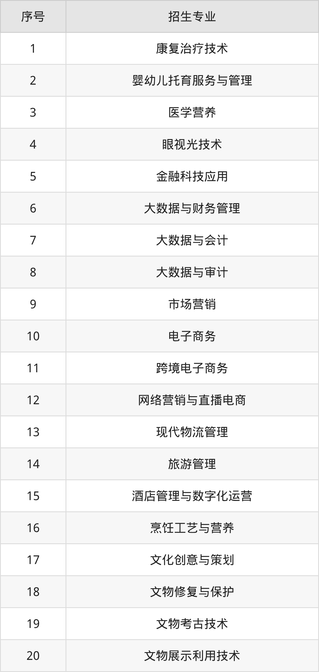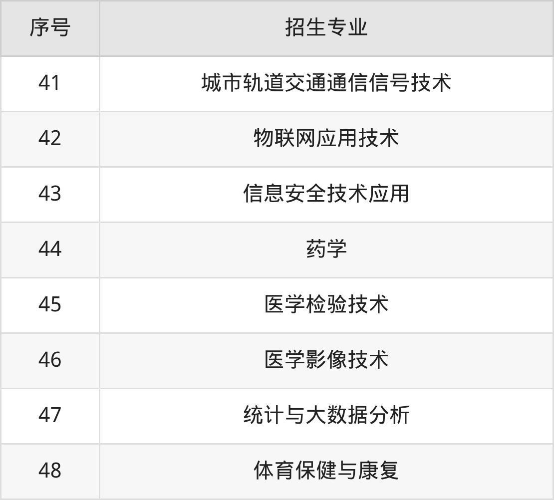 中医学、园林工程技术、建筑室内设计、工程造价、高速铁路客运服务、计算机应用技术、软件技术、大数据技术、护理、助产