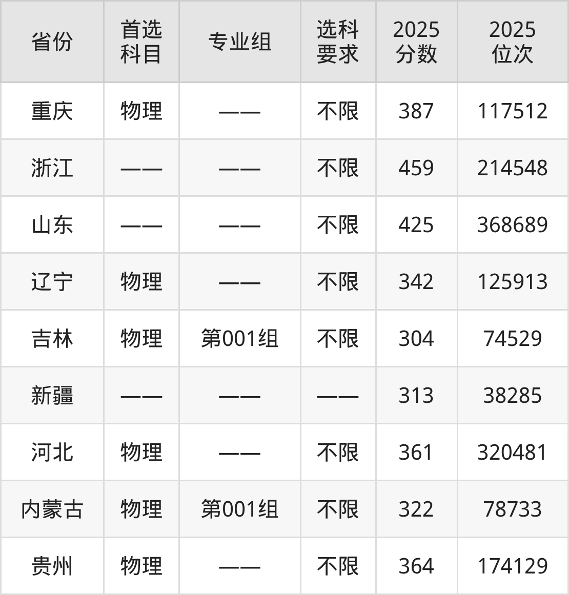 物理类各专业组分数线:第001组304分。