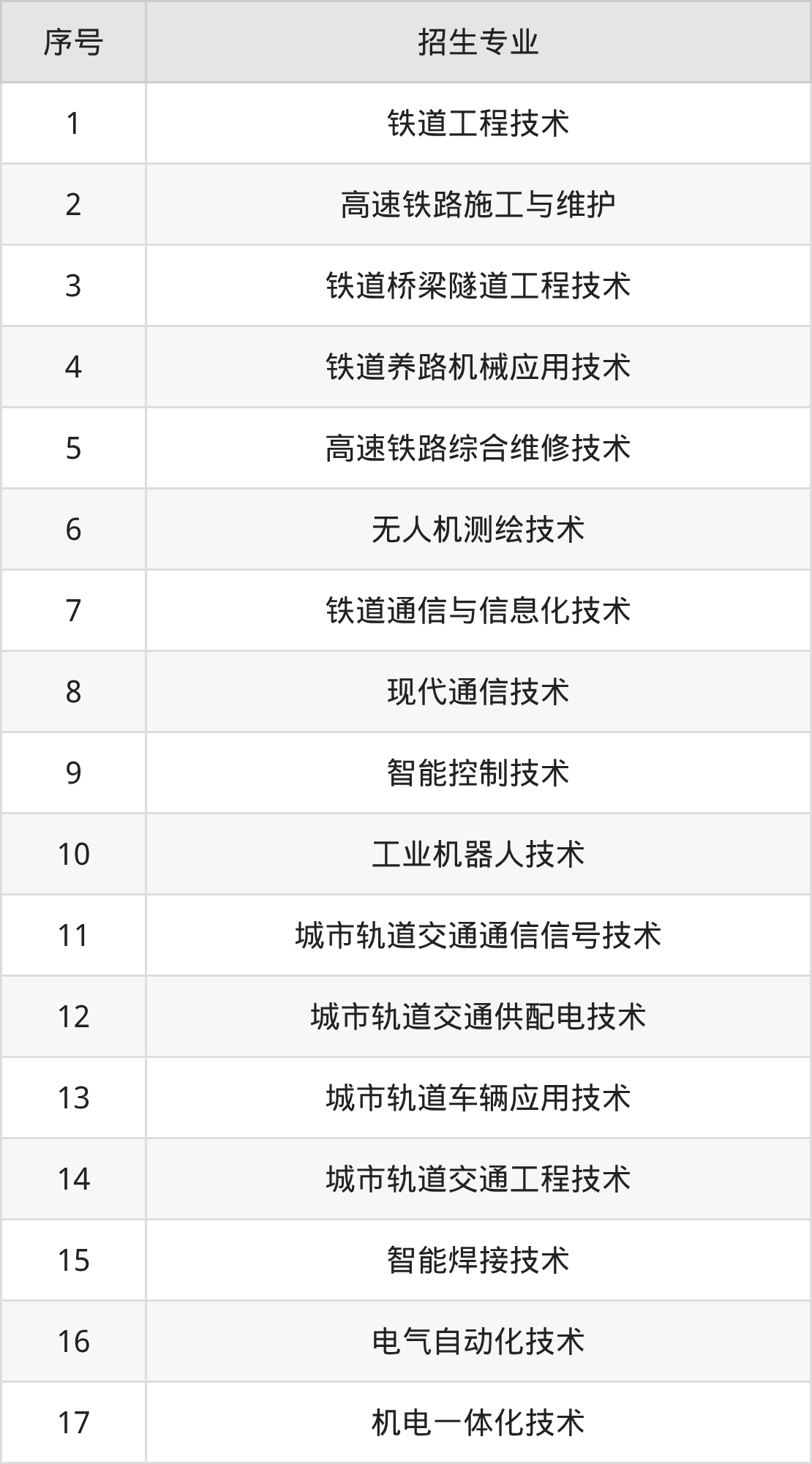 铁道交通运营管理、铁路物流管理、城市轨道交通运营管理、铁道信号自动控制、铁道供电技术、铁道机车运用与维护、铁道机车车辆制造与维护、铁道车辆技术、动车组检修技术、高速铁路动车组制造与维护
