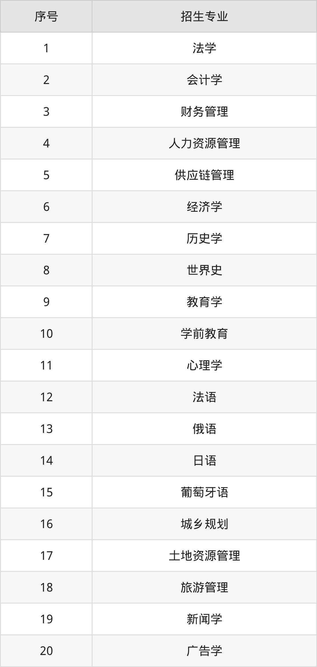 马克思主义理论、小学教育、汉语言文学、英语、思想政治教育、秘书学、汉语国际教育、社会学、社会工作、行政管理