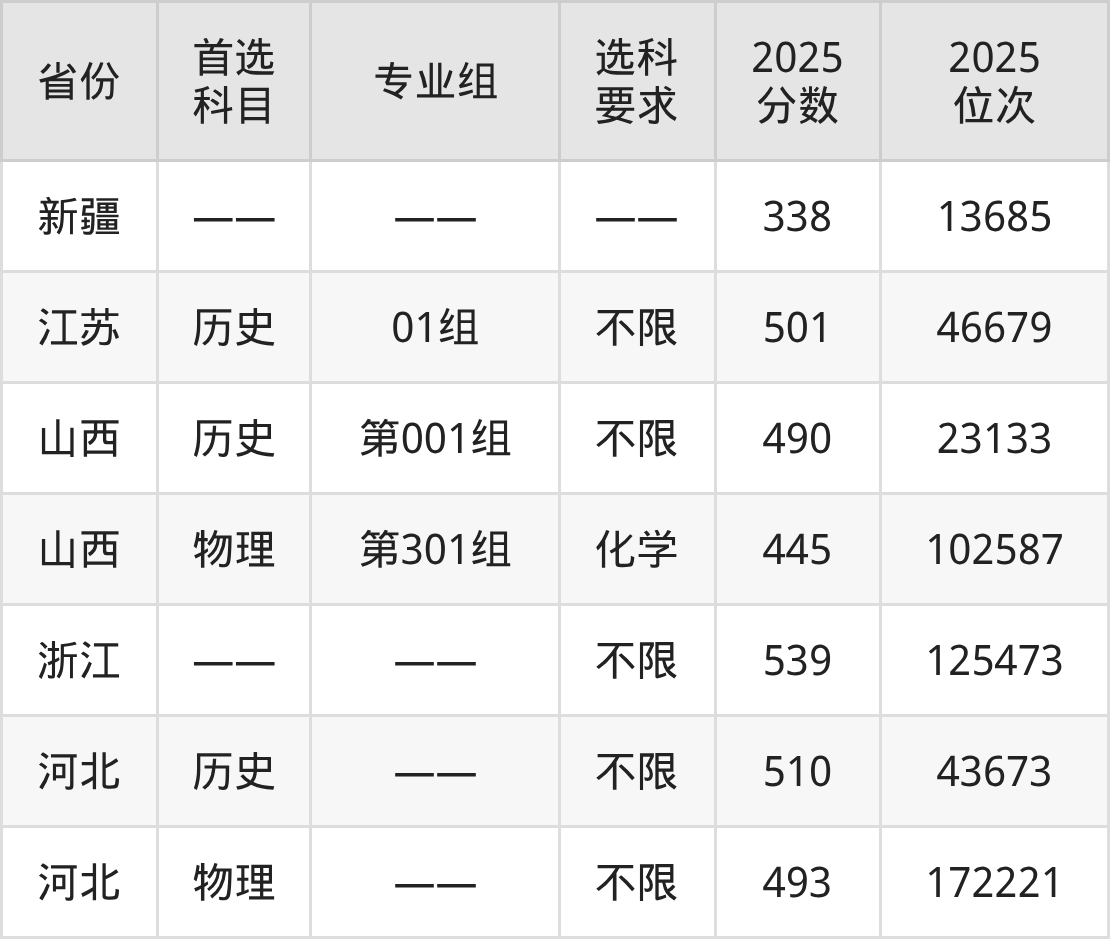 历史类各专业组分数线:第001组490分。