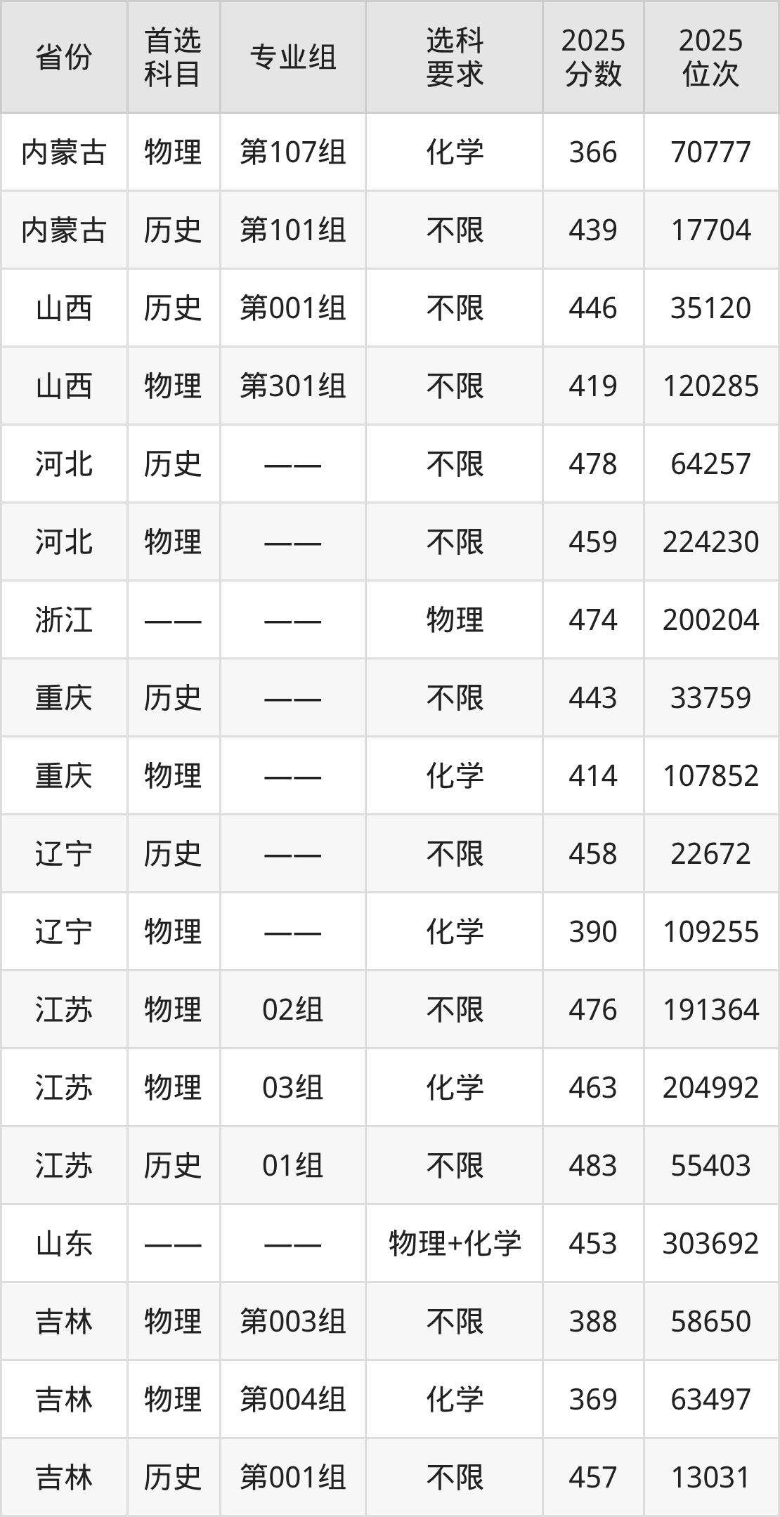 物理类各专业组分数线:第107组366分。