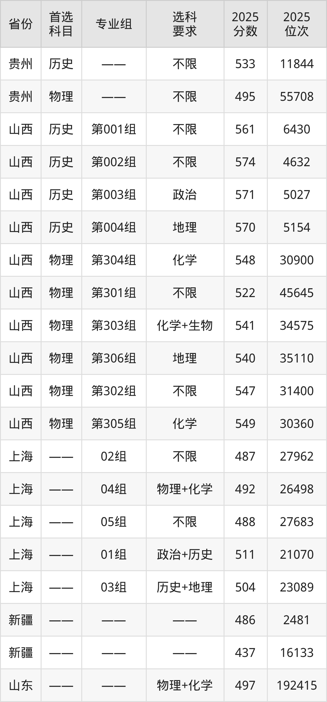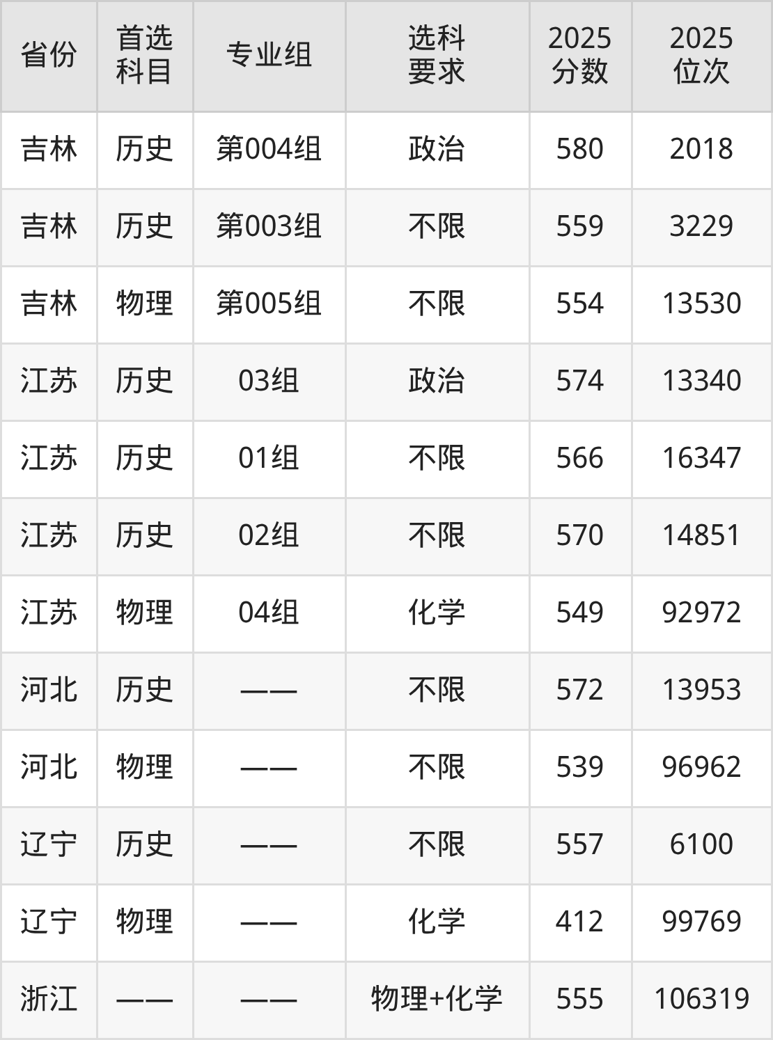 历史类各专业组分数线:第001组561分、第002组574分、第003组571分、第004组570分。