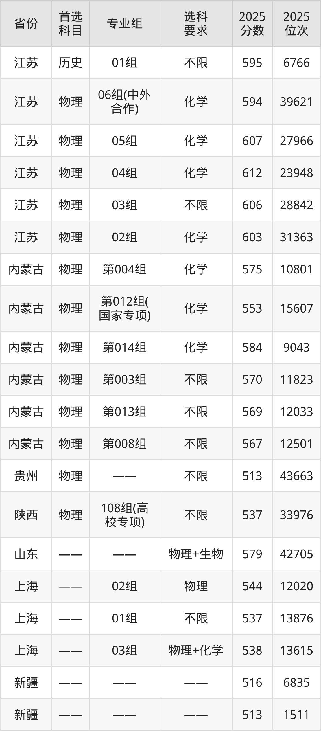 物理类各专业组分数线:06组(中外合作)594分、05组607分、04组612分、03组606分、02组603分。