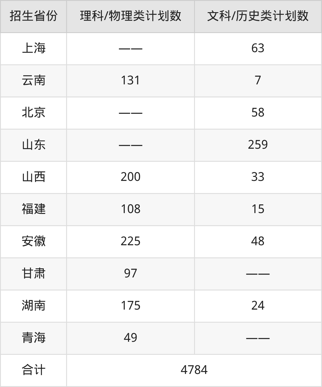 分科类招生计划:物理类3373人、3+3省份740人、文科8人、理科56人、历史类607人