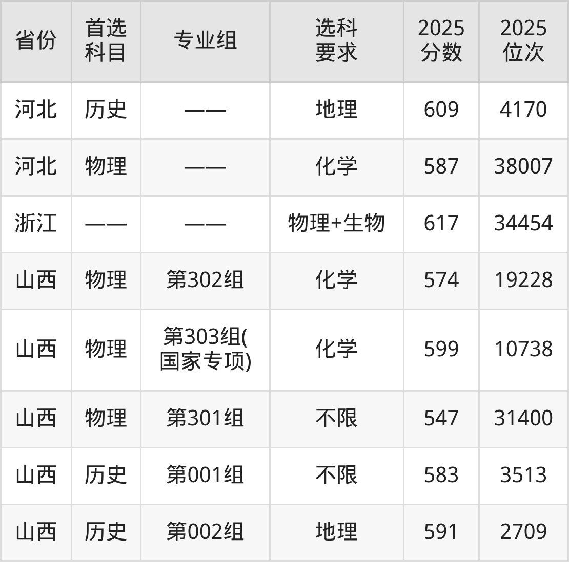 物理类各专业组分数线:第302组574分、第303组(国家专项)599分、第301组547分。