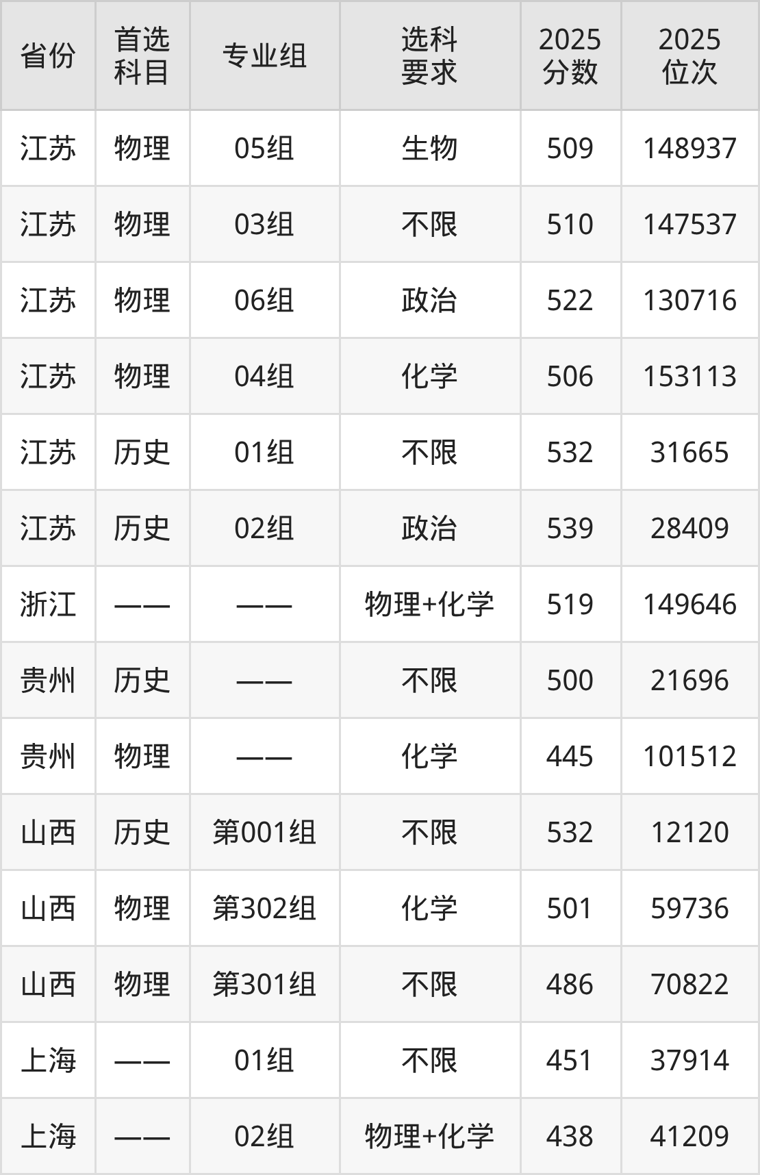 物理类各专业组分数线:第302组501分、第301组486分。