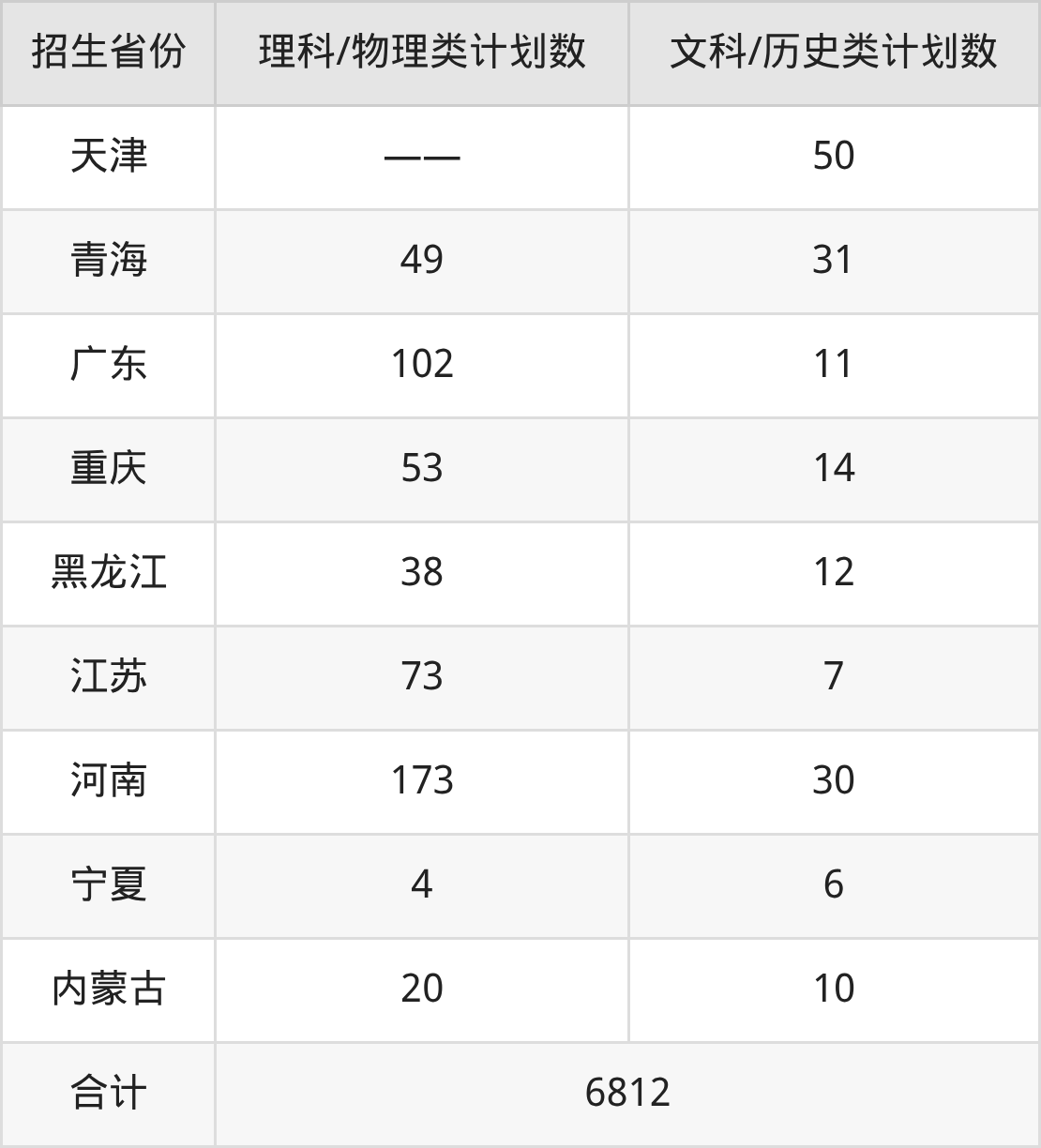 山东农业大学招生简章显示:学校在全国29个省(市、自治区)招收6812人,包括3+3省份4743人、物理类1771人、历史类288人、理科10人,招生专业有农学、园艺、农林经济管理等。