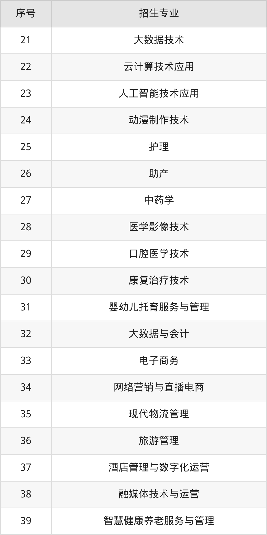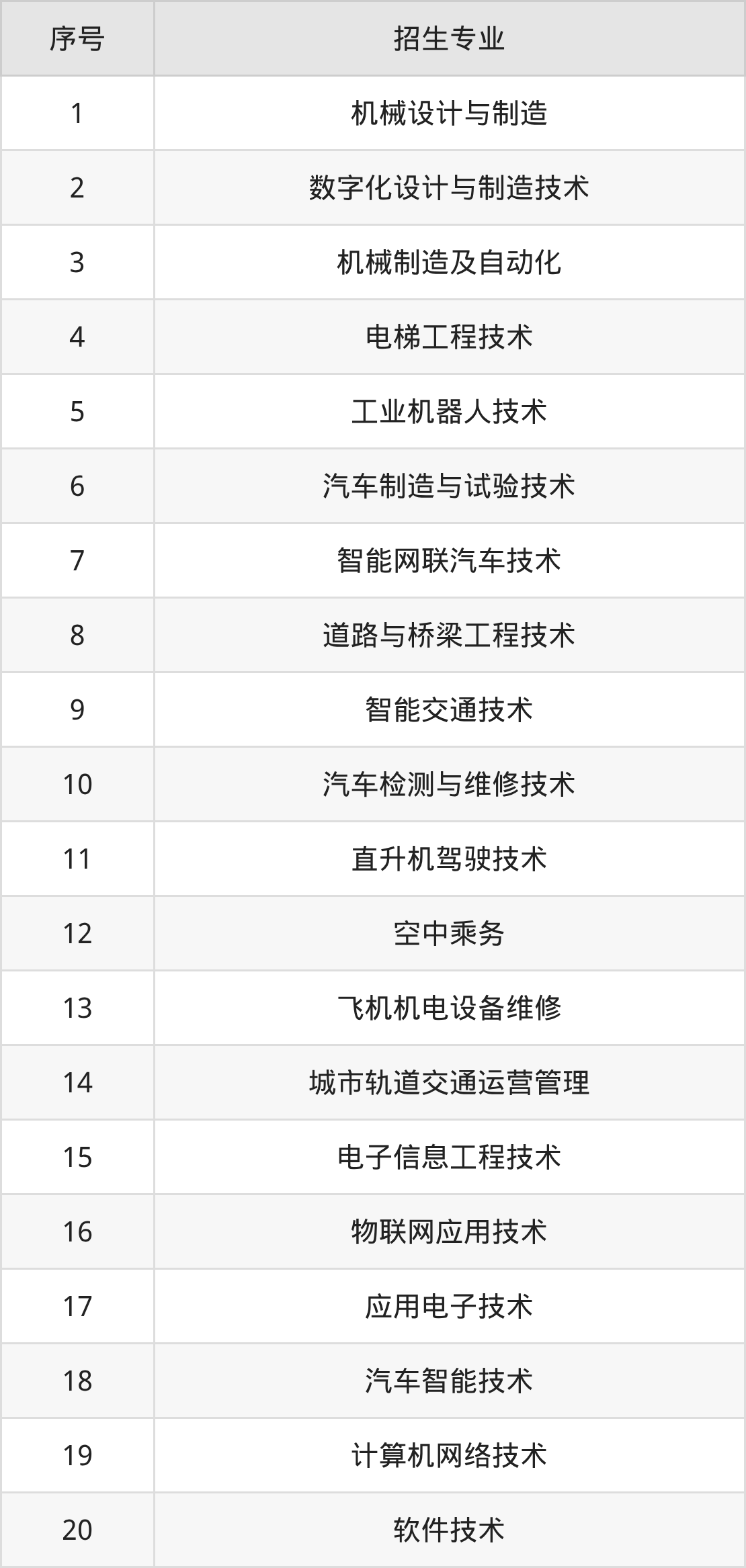 中医学、机电一体化技术、无人机应用技术、新能源汽车技术、数字媒体技术、建筑室内设计、建筑工程技术、建筑设备工程技术、建筑智能化工程技术、工程造价