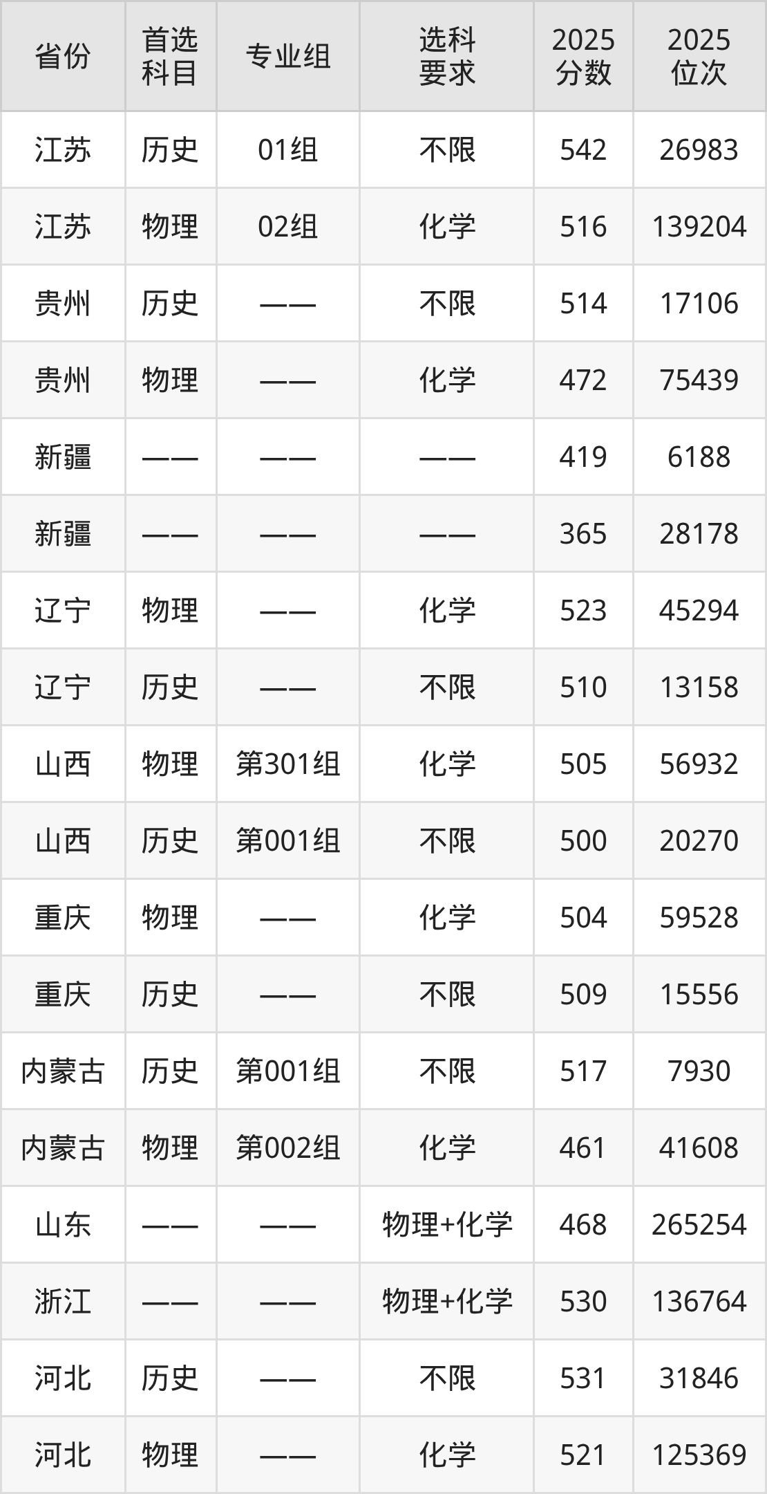 物理类各专业组分数线:第301组505分。