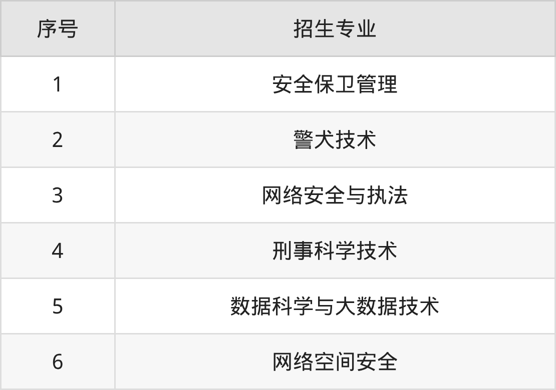 治安管理、刑事侦查、侦查学、治安学、警务指挥与战术、禁毒学、反恐警务、法学、中国少数民族语言文学、安全防范技术