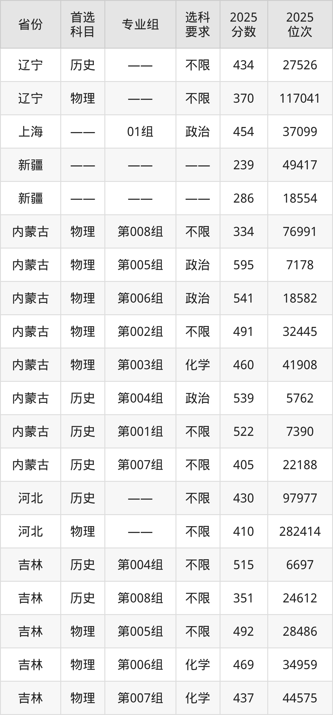 物理类各专业组分数线:第008组334分、第005组595分、第006组541分、第002组491分、第003组460分。